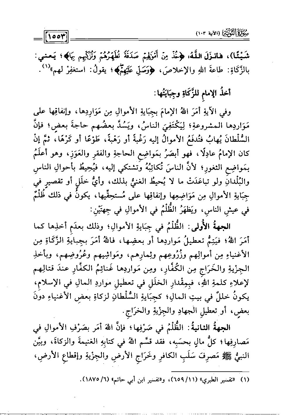 وفي الآيةِ أمَرَ اللهُ الإمامَ بجِبَايةِ الأموالِ مِن مَوَارِدِها، وإنفاقها على مَوَاردِها المشروعة، لِيَكْتَفِيَ الناسُ، ويَسُدَّ بعضُهم حاجةَ بعضٍ؛ فإنَّ السُّلْطانَ يُهابُ فتُدفَعُ الأموالُ إليه رَغْبَةً أو رَهْبةً، طَوْعًا أو كَرْهَا، ثم إنْ كان الإمامُ عادِلًا، فهو أبصَرُ بمَواضِعِ الحاجةِ والفقرِ والعَوَزِ، وهو أعلَمُ بمَواضِعِ الثغورِ؛ لأنَّ الناسَ تُكاتِبُهُ وتشتكي إليه، فيُحِيطُ بأحوالِ الناسِ والبُلْدانِ ولو تباعَدَت ما لا يُحيطُ الغنيُّ بذلك، وأيُّ خلَلٍ أو تقصيرٍ في جِبَايةِ الأموالِ مِن مَوَاضِعِها وإنفاقِها على مُستحِقِّيها، يكونُ في ذلك ظُلْمٌ في عيشِ الناس، ويَظهَرُ الظُّلْمُ في الأموالِ في جِهتَيْنِ: