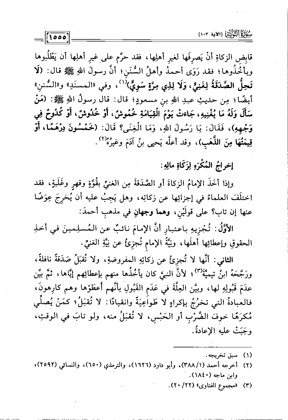 الثاني: أنَّها لا تُجزِئُ عن زكاتِهِ المفروضة، ولا تُقبَلُ صَدَقةً نافلةً، ورَجَّحَة ابنُ تيميَّةَ (٣)؛ لأنَّ النبيَّ كان يأخُذُها منهم بإعطائِهم إيَّاها، ثم بيَّن عدَمَ قَبُولِهِ لها، وبيَّن العِلَّةَ في عَدَمِ القَبُولِ بأنَّهم أَعطَوْها وهم كارِهونَ، فالعبادةُ التي تخرُجُ بإكراهٍ لا طَواعِيَةً وانقيادًا: لا تُقبَل، كمَنْ يُصلِّي مُكرَهَا خوفَ الضَّرْبِ أو الحَبْس، لا تُقبَلُ منه، ولو تابَ في الوقت، وجَبَت عليه الإعادةُ.