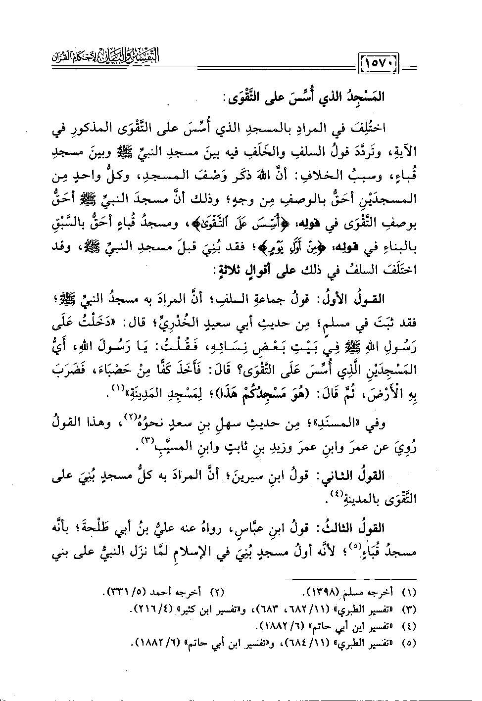 القولُ الثالثُ" قولُ ابنِ عبَّاسٍ، رواهُ عنه عليُّ بن أبي طَلْحةَ؛ بأنَّه مسجدُ قُبَاءٍ (٥)؛ لأنَّه أولُ مسجدٍ بُنِيَ في الإسلامِ لمَّا نزَل النبيُّ علي بني