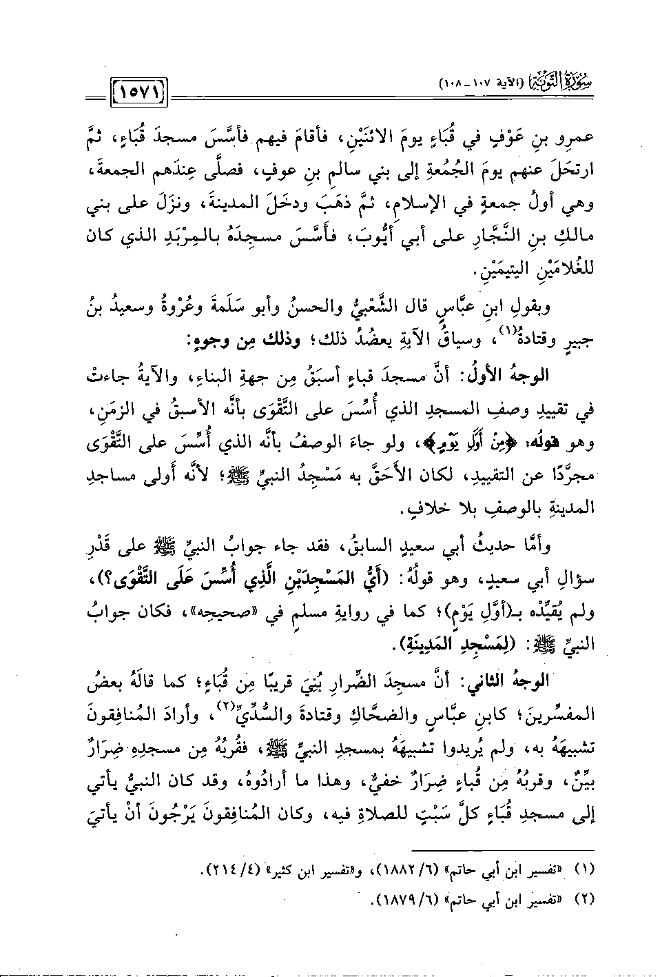 الوجهُ الثاني: أنَّ مسجِدَ الضِّرارِ بُنيَ قريبًا مِن قُبَاءٍ؛ كما قالَهُ بعضُ المفسِّرينَ؛ كابنِ عبَّاسٍ والضحَّاكِ وقتادةَ والسُّدِّيِّ (٢)، وأرادَ المُنافِقونَ تشبيهَهُ به، ولم يُريدوا تشبيهَهُ بمسجدِ النبيِّ - صلى الله عليه وسلم -، فقُربُهُ مِن مسجدِهِ ضِرَارٌ بيِّنٌ، وقربُهُ مِن قُباءٍ ضِرَارٌ خفيٌّ، وهذا ما أرادُوهُ، وقد كان النبيُّ يأتي إلى مسجدِ قُبَاءٍ كلَّ سَبْتٍ للصلاةِ فيه، وكان المُنافِقونَ يَرْجُونَ أنْ يأتيَ