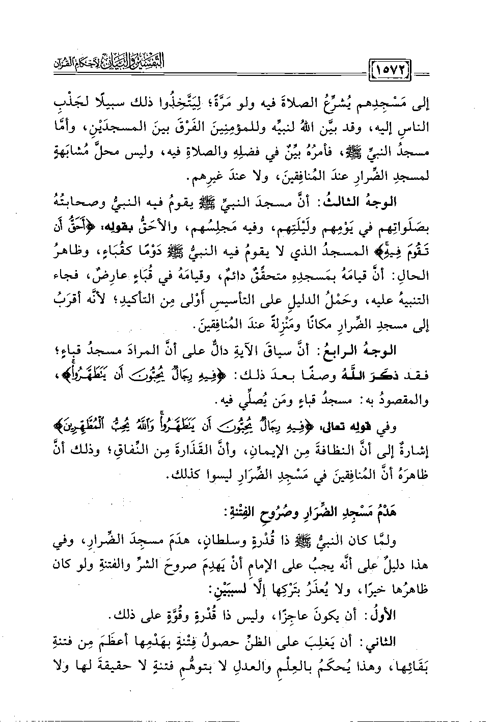 ولمَّا كان النبيُّ - صلى الله عليه وسلم - ذا قُدْرةٍ وسلطانٍ، هدَمَ مسجِدَ الضِّرار، وفي هذا دليلٌ على أنه يجبُ على الإمامِ أنْ يَهدِمَ صروحَ الشرِّ والفتنةِ ولو كان ظاهرُها خيرًا، ولا يُعذَرُ بتَرْكِها إلَّا لسببَيْنِ: