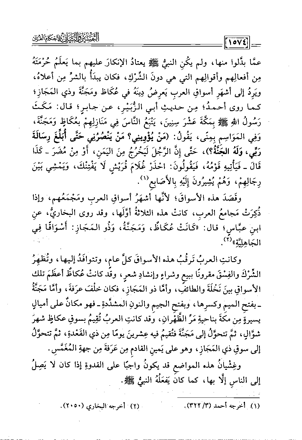 وقَصَدَ هذه الأسواقَ؛ لأنَّها أشهَرُ أسمواقِ العربِ ومَجْمَعُهم، وإذا ذُكِرَت مَحامعُ العرب، كانتْ هذه الثلاثةُ أوَّلَها، وقد روى البخاريُّ، عنِ ابنِ عبَّاسٍ؛ قال: "كَانَتْ عُكَاظٌ، وَمَجَنَّةُ، وَذُو المَجَازِ: أسْوَاقًا فِي الجَاهِلِيَّةِ" (٢).