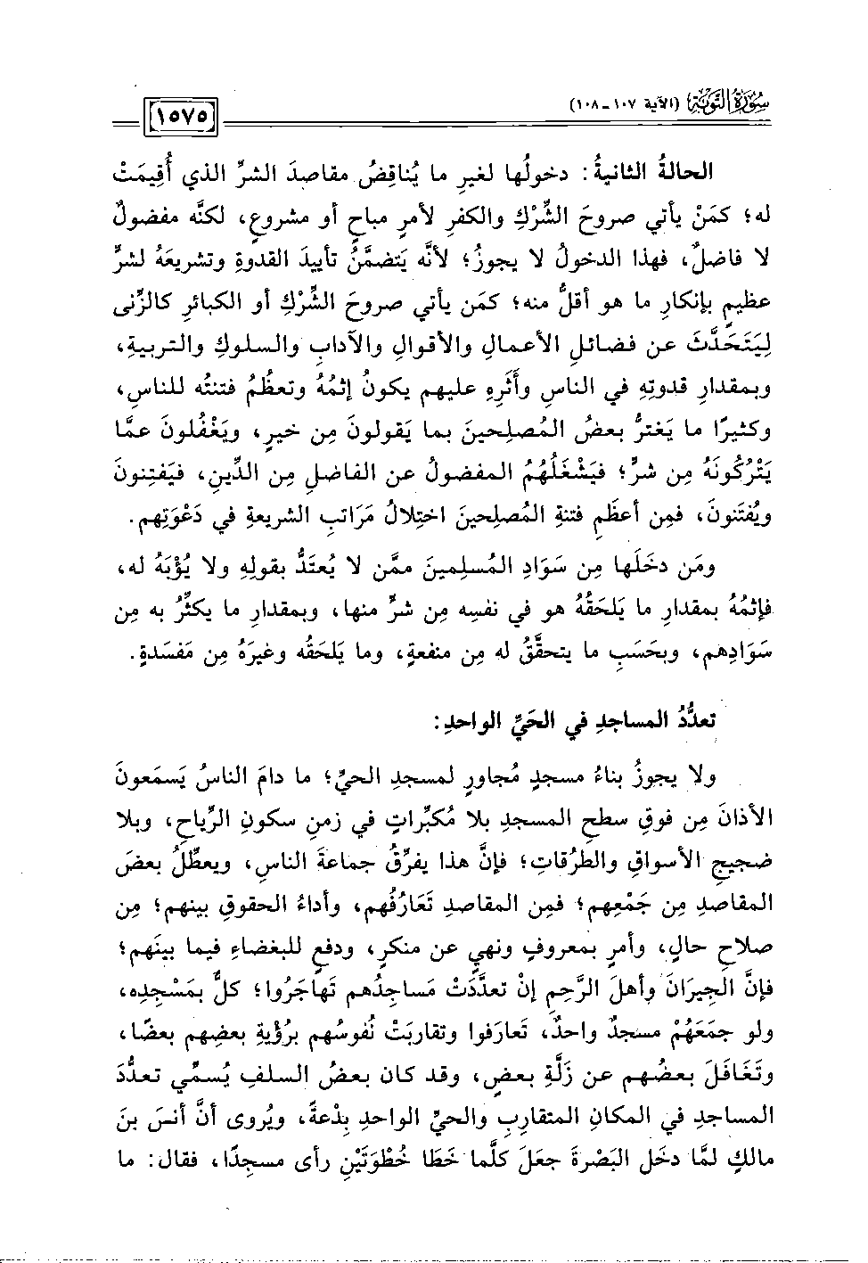 ولا يجوزُ بناءُ مسجدٍ مُجاورٍ لمسجدِ الحيِّ؛ ما دامَ الناسُ يَسمَعونَ الأذانَ مِن فوقِ سطحِ المسجدِ بلا مُكبِّراتٍ في زمنِ سكونِ الرِّياح، وبلا ضجيجِ الأسواقِ والطرُقاتِ؛ فإنَّ هذا يفرِّقُ جماعةَ الناس، ويعطِّلُ بعضَ المقاصدِ مِن جَمْعِهم؛ فمِن المقاصدِ تَعَارُفُهم، وأداءُ الحقوقِ بينهم؛ مِن صلاحِ حال، وأمرٍ بمعروفٍ ونهيِ عن منكرٍ، ودفعٍ للبغضاءِ فيما بينَهم؛ فإنَّ الجِيرَانَ لو أهلَ الرَّحِم إنْ تعدَّدَتْ مَساجِدُهم تَهاجَرُوا؛ كلٌّ بمَسجِدِه، ولو جمَعَهُمْ مسجدٌ واحدٌ، تَعارَفوا وتقاربَتْ نُفوسُهم برُؤْيةِ بعضِهم بعضًا، وتَغَافَلَ بعضُهم عن زَلَّةِ بعضٍ، وقد كان بعضُ السلفِ يُسمَّي تعدُّدَ المساجدِ في المكانِ المتقارِبِ والحيِّ الواحدِ بِدْعةً، ويُروى أنَّ أنسَ بنَ مالكٍ لمَّا دخَل البَصْرةَ جعَلَ كلَّما خَطَا خُطْوَتَيْنِ رأى مسجِدًا، فقال: ما