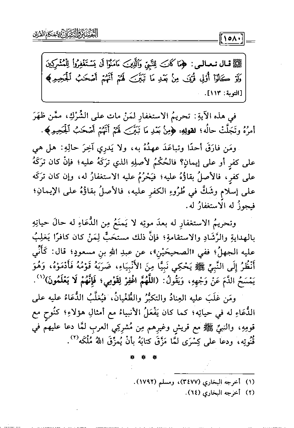 * قال تعالى: {مَا كَانَ لِلنَّبِيِّ وَالَّذِينَ آمَنُوا أَنْ يَسْتَغْفِرُوا لِلْمُشْرِكِينَ وَلَوْ كَانُوا أُولِي قُرْبَى مِنْ بَعْدِ مَا تَبَيَّنَ لَهُمْ أَنَّهُمْ أَصْحَابُ الْجَحِيمِ} [التوبة: ١١٣].