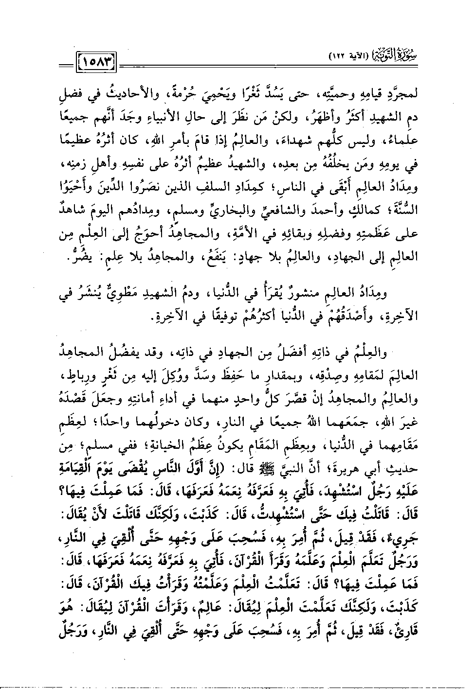 والعِلْمُ في ذاتِهِ أفضَلُ مِن الجهادِ في ذاتِه، وقد يفضُلُ المجاهِدُ العالِمَ لمَقامِهِ وصِدْقِه، وبمقدارِ ما حَفِظَ وسَدَّ ووُكِلَ إليه مِن ثَغْرٍ ورِباطٍ، والعالِمُ والمجاهِدُ إنْ قصَّرَ كلُّ واحدٍ منهما في أداءِ أمانتِهِ وجعَلَ قَصْدَهُ غبرَ الله، جمَعَهما اللهُ جميعًا في النار، وكان دخولُهما واحدًا، لعِظَمِ مَقَامِهما في الدُّنيا، ويعِظَمِ المَقَامِ يكونُ عِظَمُ الخيانةِ؛ ففي مسلمٍ؛ مِن حديثِ أبي هريرةَ؛ أنَّ النبيِّ - صلى الله عليه وسلم - قال: "إنَّ أَوَّلَ النَّاسِ يُقْضَى يَوْمَ الْقِيَامَةِ عَلَيْهِ رَجُلٌ اسْتُشْهِدَ، فَأُتِيَ بِهِ فَعَرَّفَهُ نِعَمَهُ فَعَرَفَهَا، قَالَ: فَمَا عَمِلْتَ فِيهَا؟ قَالَ: قَاتَلْتُ فِيكَ حَتَّى اسْتُشْهِدتُّ، قَالَ: كَذَبْتَ، وَلَكِنَّكَ قَاتَلْتَ لأَنْ يُقَالَ: جَرِيءٌ، فَقَدْ قِيلَ، ثُمَّ أُمِرَ بِه، فَسُحِبَ عَلَى وَجْهِهِ حَتَّى أُلْقِيَ فِي النَّار، وَرَجُلٌ تَعَلَّمَ العِلْمَ وَعَلَّمَهُ وَقَرَأَ الْقُرْآنَ، فَأُتِيَ بِهِ فَعَرَّفَهُ نِعَمَهُ فَعَرَفَهَا، قَالَ: فَمَا عَمِلْتَ فِيهَا؟ قَالَ: تَعَلَّمْتُ الْعِلْمَ وَعَلَّمْتُهُ وَقَرَأْتُ فِيكَ الْقُرْآنَ، قَالَ: كَذَبْتَ، وَلَكِنَّكَ تَعَلَّمْتَ الْعِلْمَ لِيُقَالَ: عَالِمٌ، وَقَرَأْتَ الْقُرْآنَ لِيُقَالَ: هُوَ قَارِئٌ، فَقَدْ قِيلَ، ثم أُمِرَ بِه، فَسُحِبَ عَلَى وَجْهِهِ حَتَّى أُلْقِيَ في النَّار، وَرَجُلٌ