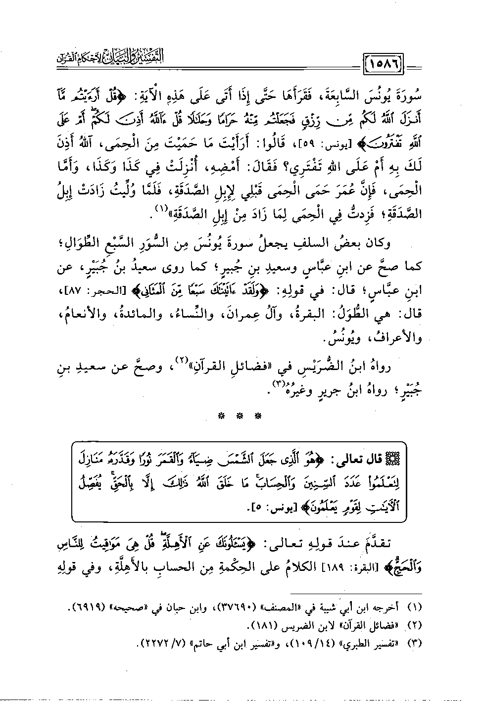وكان بعضُ السلفِ يجعلُ سورةَ يُونُسَ مِن السُّوَرِ السَّبْعِ الطِّوَال، كما صحَّ عن ابنِ عبَّاسٍ وسعيدِ بنِ جُبيرٍ؛ كما روى سعيدُ بن جُبَيْرٍ، عن ابنِ عبَّاسٍ؛ قال" في قولِهِ: {وَلَقَدْ آتَيْنَاكَ سَبْعًا مِنَ الْمَثَانِي} [الحجر: ٨٧]، قال: هي الطُّوَلُ: البقرةُ، وآلُ عِمرانَ، والنِّساءُ والمائدةُ، والأنعامُ، والأعرافُ، ويُونُسُ.
