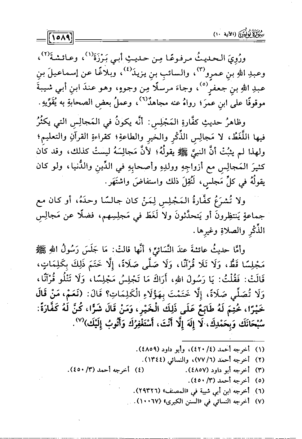 وأمَّا حديثُ عائشةَ عندَ النَّسَائيِّ؛ أنَّها قالتْ: مَا جَلَسَ رَسُولُ اللهِ - صلى الله عليه وسلم - مَجْلِسًا قَطُّ، وَلَا تَلَا قُرْآنًا، وَلَا صَلَّى صَلَاةً، إلَّا خَتَمَ دَلِكَ بِكَلِمَاتٍ، قَالَت: فَقُلْتُ: يَا رَسُولَ الله، أرَاكَ مَا تَجْلِسُ مَجلِسًا، وَلَا تَتْلُو قُرْآنًا، وَلَا تصَلِّي صَلَاةً، إِلَّا خَتَمْتَ بِهَؤُلَاءِ الْكَلِمَاتِ؟ قَالَ: (نَعَمْ، مَنْ قَالَ خَيْرًا، خُتِمَ لَهُ طَابَعٌ عَلَى ذَلِكَ الْخَيْر، وَمَنْ قَالَ شَرًّا، كُنَّ لَهُ كَفَّارَةً: سُبْحَانَكَ وَبِحَمْدِكَ، لَا إِلَهَ إِلَّا أَنْتَ، أَسْتَغْفِرُكَ وَأَتُوبُ إِلَيْكَ) (٧).