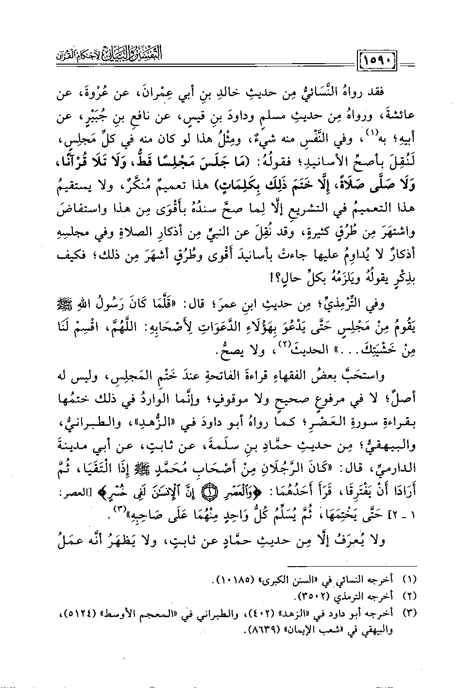 فقد رواهُ النَّسَائيُّ مِن حديثِ خالدِ بنِ أبي عِمْرانَ، عن عُرْوةَ، عن عائشةَ، ورواهُ مِن حديثِ مسلمِ وداودَ بنِ قيسٍ، عن نافعِ بنِ جُبَيْرٍ، عن أبيهِ؛ له (١)، وفي النَّفْسِ منه شيءٌ، ومِثْلُ هذا لو كان مه في كلِّ مَجلِس، لَنُقِلَ بأصحِّ الأسانيدِ؛ فقولُهُ: (مَا جَلَسَ مَجْلِسًا قَطُّ، وَلَا تَلَا قُرْآنًا، وَلَا صَلَّى صَلَاةً، إِلَّا خَتَمَ ذَلِكَ بِكَلِمَاتٍ) هذا تعميمٌ مُنكَّرٌ، ولا يستقيمُ هذا التعميمُ في التشريعِ إلَّا لِما صحَّ سندُهُ بأَقْوَى مِن هذا واستفاضَ واشتهَرَ مِن طُرُقٍ كثيرةٍ، وقد نُقِلَ عن النبيِّ مِن أذكارِ الصلاةِ وفي مجلسِهِ أدكارٌ لا يُداوِمُ عليها جاءت بأسانيدَ أقوى وطُرُقِ أشهَرَ مِن ذلك؛ فكيف بذِكْرٍ يقولُهُ ويَلزَمُهُ بكلِّ حالٍ؟ !