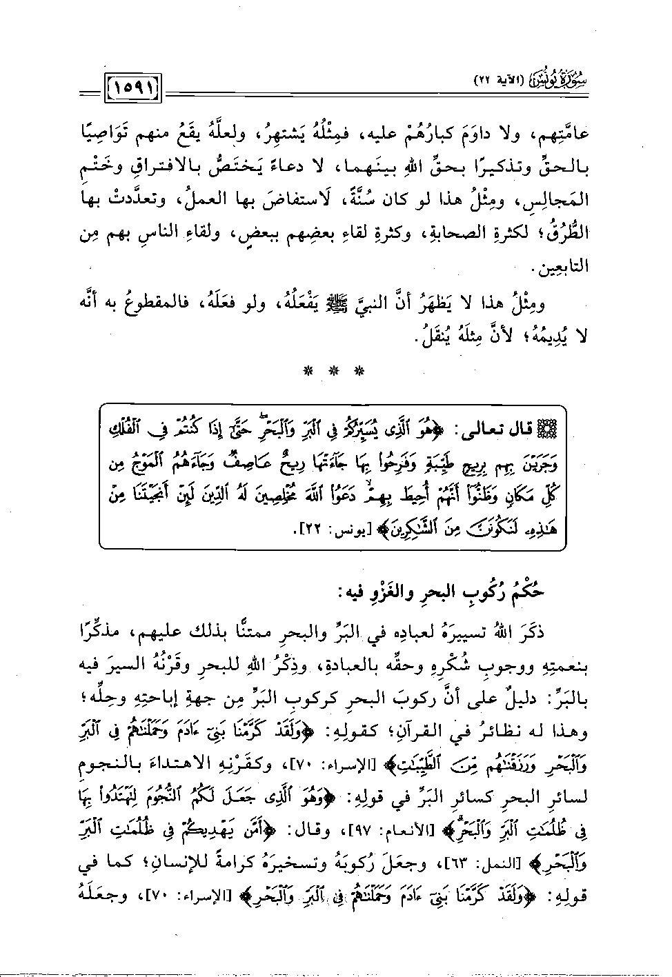 ذكَرَ اللهُ تسييرَهُ لعبادِه في البَرِّ والبحرِ ممتنًّا بذلك عليهم، مذكِّرًا بنعمتِهِ ووجوبِ شُكْرِهِ وحقِّه بالعبادة، وذِكْرُ اللهِ للبحرِ وقَرْنُهُ السيرَ فيه بالبَرِّ: دليلٌ على أنَّ ركوبَ البحرِ كركوبِ البَرِّ مِن جهةِ إباحتِهِ وحِلِّه؛ وهذا له نظائرُ في القرآنِ؛ كقولِهِ: {وَلَقَدْ كَرَّمْنَا بَنِي آدَمَ وَحَمَلْنَاهُمْ فِي الْبَرِّ وَالْبَحْرِ وَرَزَقْنَاهُمْ مِنَ الطَّيِّبَاتِ} [الإسراء: ٧٠]، وكقَرْنِهِ الاهتداءَ بالنجومِ لسائرِ البحرِ كسائرِ البَر في قولِهِ: {وَهُوَ الَّذِي جَعَلَ لَكُمُ النُّجُومَ لِتَهْتَدُوا بِهَا فِي ظُلُمَاتِ الْبَرِّ وَالْبَحْرِ} [الأنعام: ٩٧]، وقال: {أَمَّنْ يَهْدِيكُمْ فِي ظُلُمَاتِ الْبَرِّ وَالْبَحْرِ} [النمل: ٦٣]، وجعَلَ رُكوبَهُ وتسخيرَهُ كرامةً للإنسانِ؛ كما في قولِهِ: {وَلَقَدْ كَرَّمْنَا بَنِي آدَمَ وَحَمَلْنَاهُمْ فِي الْبَرِّ وَالْبَحْرِ} [الإسراء: ٧٠]، وجعَلَههُ