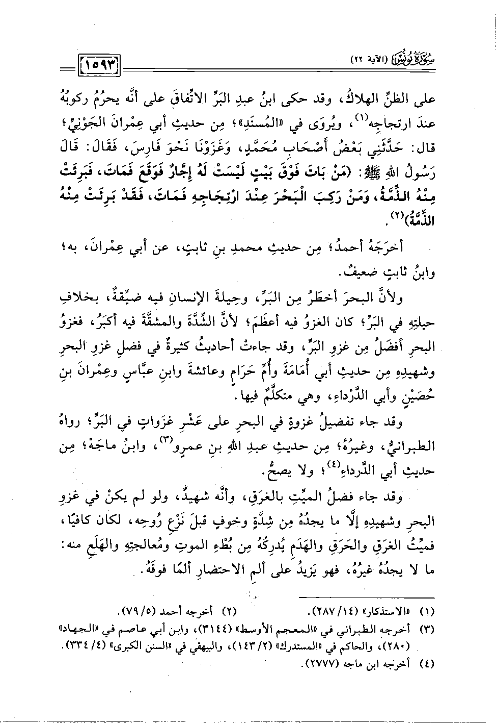 وقد جاء تفضيلُ غزوةٍ في البحرِ على عَشْرِ غزَواتٍ في البَرِّ؛ رواهُ الطبرانيُّ، وغيرُهُ؛ مِن حديثِ عبد اللهِ بنِ عمرٍو (٣)، وابنُ ماجَهُ؛ مِن حديثِ أبي الدَّرداءِ (٤)؛ ولا يصحُّ.