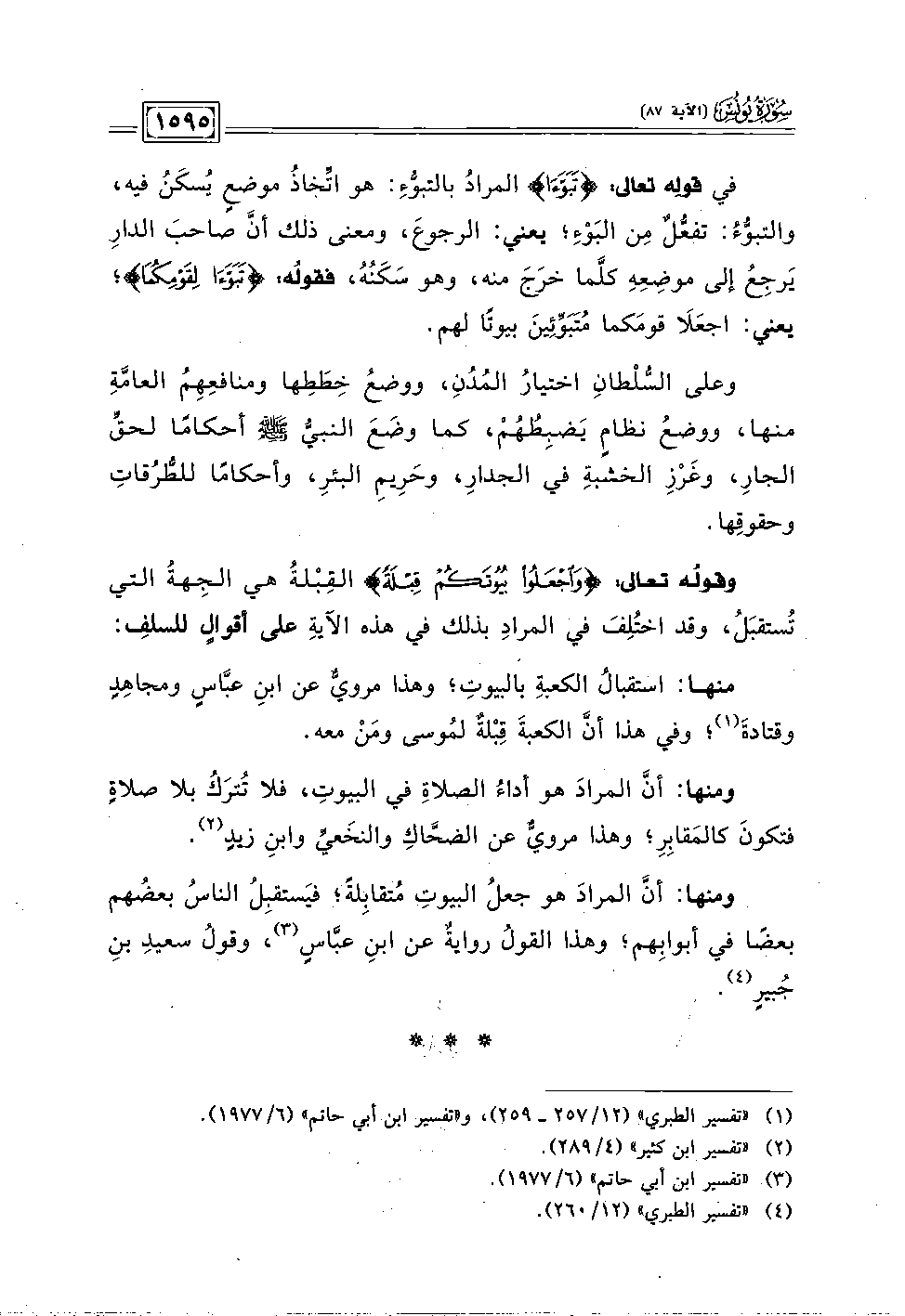 ومنها: أنَّ المرادَ هو جعلُ البيوثِ مُتقابِلةً؛ فيَستقبِلُ الناسُ بعضُهم بعضًا في أبوابِهم؛ وهذا القولُ روايةٌ عن ابنِ عبَّاسٍ (٣)، وقولُ سعيدِ بنِ جُبيرٍ (٤).