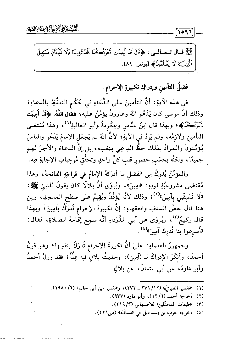 في هذه الآيةِ: أنَّ التأمينَ على الدُّعَاءِ في حُكمِ التلفُّظِ بالدعاءِ؛ وذلك أنَّ موسى كان يَدْعُو اللهَ وهارونُ يؤمَّنُ عليه؛ فقال اللهُ: {قَالَ قَدْ أُجِيبَتْ دَعْوَتُكُمَا}؛ وبهذا قال ابنُ عبَّاسٍ وعِكْرِمةُ وأبو العاليةِ (١)، وهذا مُقتضى التأمينِ ولازِمُه، ولم يَرِدْ في الآيةِ؛ لأنَّ اللهَ لم يَجعَلِ الإمامَ يَدْعُو والناسَ يُؤمِّنونَ والمرادُ بذلك حظُّ الداعِي بنفسِه، بل إنَّ الدعاءَ والأجرَ لهم جميعًا، ولكنَّه بحسَبِ حضورِ قلبِ كلَّ واحدٍ وتحقُّقِ مُوجِباتِ الإجابةِ فيه.