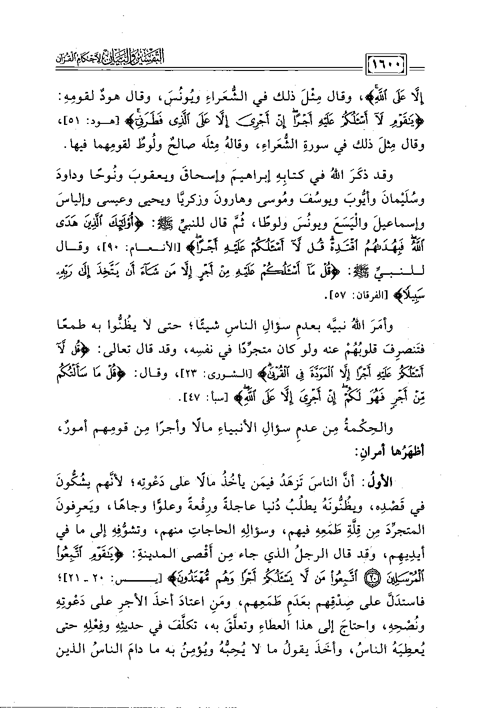 وقد ذكَرَ اللهُ في كتابِهِ إبراهيمَ وإسحاقَ ويعقوبَ ونُوحًا وداودَ وسُلَيْمانَ وأيُّوبَ ويوسُفَ ومُوسى وهارونَ وزكريَّا ويحيى وعيسى وإلياسَ وإسماعيلَ والْيَسَعَ ويونُسَ ولوطًا، ثُمَّ قال للنبيِّ - صلى الله عليه وسلم - {أُولَئِكَ الَّذِينَ هَدَى اللَّهُ فَبِهُدَاهُمُ اقْتَدِهْ قُلْ لَا أَسْأَلُكُمْ عَلَيْهِ أَجْرًا} [الأنعام: ٩٠]، وقال للنبيِّ - صلى الله عليه وسلم -: {قُلْ مَا أَسْأَلُكُمْ عَلَيْهِ مِنْ أَجْرٍ إِلَّا مَنْ شَاءَ أَنْ يَتَّخِذَ إِلَى رَبِّهِ سَبِيلًا (٥٧)} [الفرقان: ٥٧].
