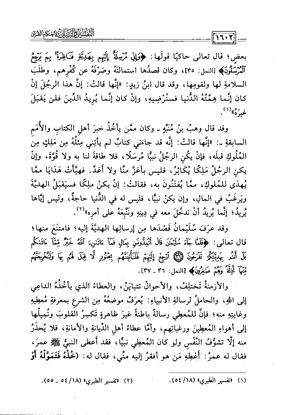 بعضٍ؛ قال تعالى حاكيًا قولَها: {وَإِنِّي مُرْسِلَةٌ إِلَيْهِمْ بِهَدِيَّةٍ فَنَاظِرَةٌ بِمَ يَرْجِعُ الْمُرْسَلُونَ (٣٥)} [النمل: ٣٥]، وكان قصدُها استمالتَهُ وصَرْفَهُ عن كُفْرِهم، وطلَبَ السلامةِ لها ولقومِها، وقد قال ابنُ زيدٍ: "إنَّها قالتْ: إنَّ هذا الرجُلَ إنْ كان إنَّما هِمَّتُهُ الدُّنيا فسنُرْضِيه، وإن كان إنَّما يُرِيدُ الدَّينَ فلن يَقبَلَ غيرَهُ" (١).