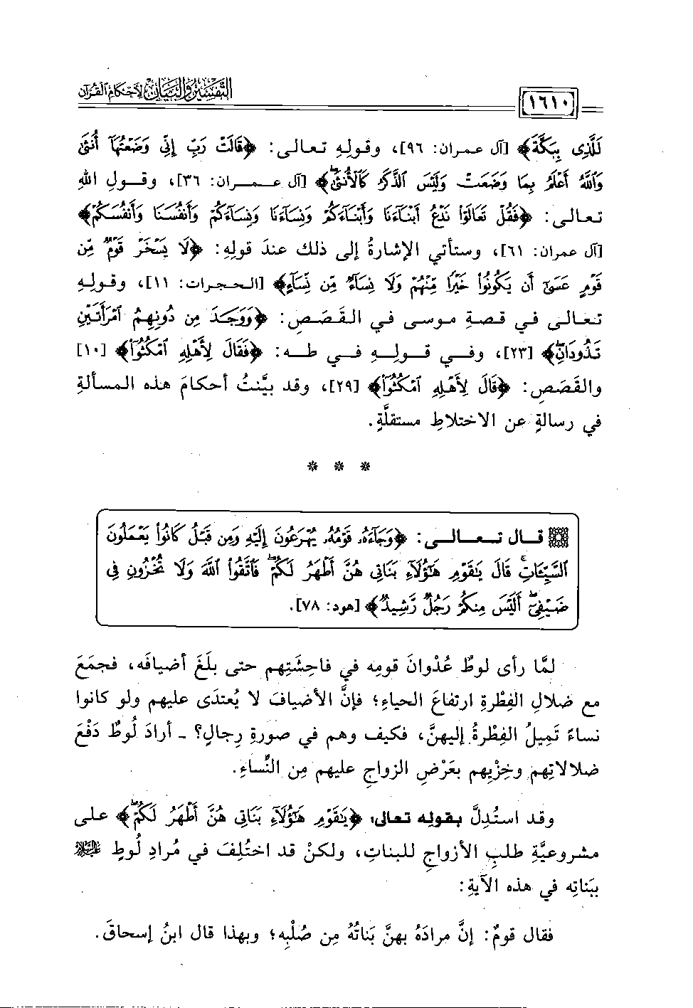 لَلَّذِي بِبَكَّةَ} [آل عمران: ٩٦]، وقولهِ تعالى: {قَالَتْ رَبِّ إِنِّي وَضَعْتُهَا أُنْثَى وَاللَّهُ أَعْلَمُ بِمَا وَضَعَتْ وَلَيْسَ الذَّكَرُ كَالْأُنْثَى} [آل عمران: ٣٦] وقولِ اللهِ تعالى: {فَقُلْ تَعَالَوْا نَدْعُ أَبْنَاءَنَا وَأَبْنَاءَكُمْ وَنِسَاءَنَا وَنِسَاءَكُمْ وَأَنْفُسَنَا وَأَنْفُسَكُمْ} [آل عمران: ٦١]، وستأني الأشارةُ إلى ذلك عندَ قولِهِ: {لَا يَسْخَرْ قَوْمٌ مِنْ قَوْمٍ عَسَى أَنْ يَكُونُوا خَيْرًا مِنْهُمْ وَلَا نِسَاءٌ} [الحجرات: ١١]، وقولهِ تعالى في قصةِ موسى في القَصَصِ: {وَوَجَدَ مِنْ دُونِهِمُ امْرَأَتَيْنِ تَذُودَانِ} [القصص: ٢٣]، وفي قولِهِ في طه: {فَقَالَ لِأَهْلِهِ امْكُثُوا} [١٠]، والقَصَصِ: {فَقَالَ لِأَهْلِهِ امْكُثُوا} [٢٩]، وقد بيَّنتُ أحكامَ هذه المسألةِ في رسالةٍ عن الاختلاطِ مستقلَّةٍ.