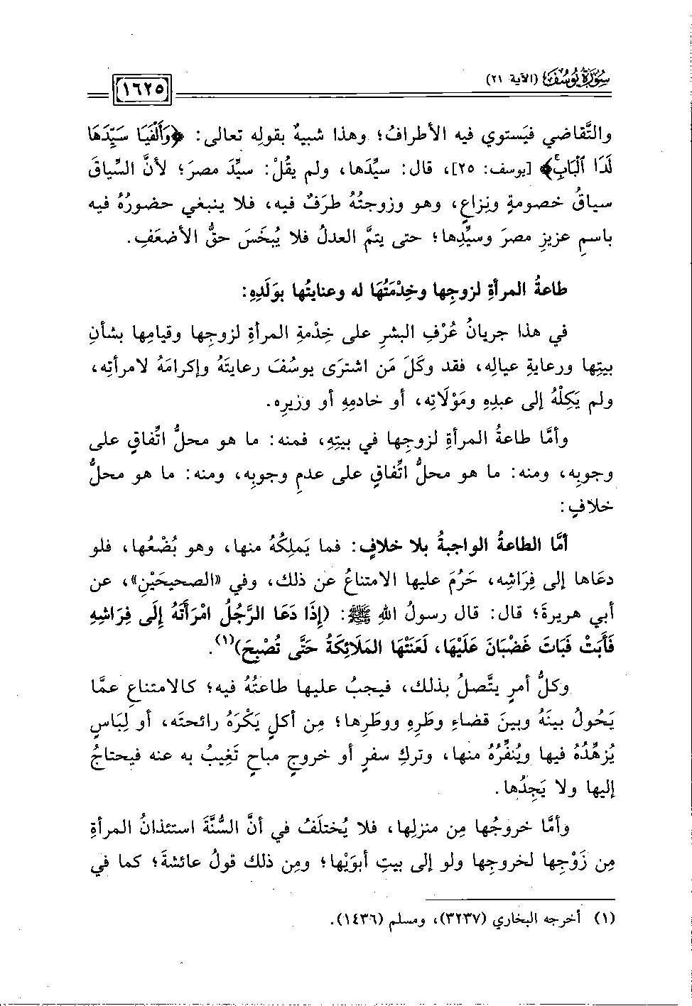 وأمَّا طاعةُ المرأةِ لزوجِها في بيتِه، فمنه: ما هو محلُّ اتِّفاقٍ على وجوبِه، ومنه: ما هو محلُّ اتِّفاقٍ على عدمِ وجوبِه، ومه: ما هو محلُّ خلافٍ: