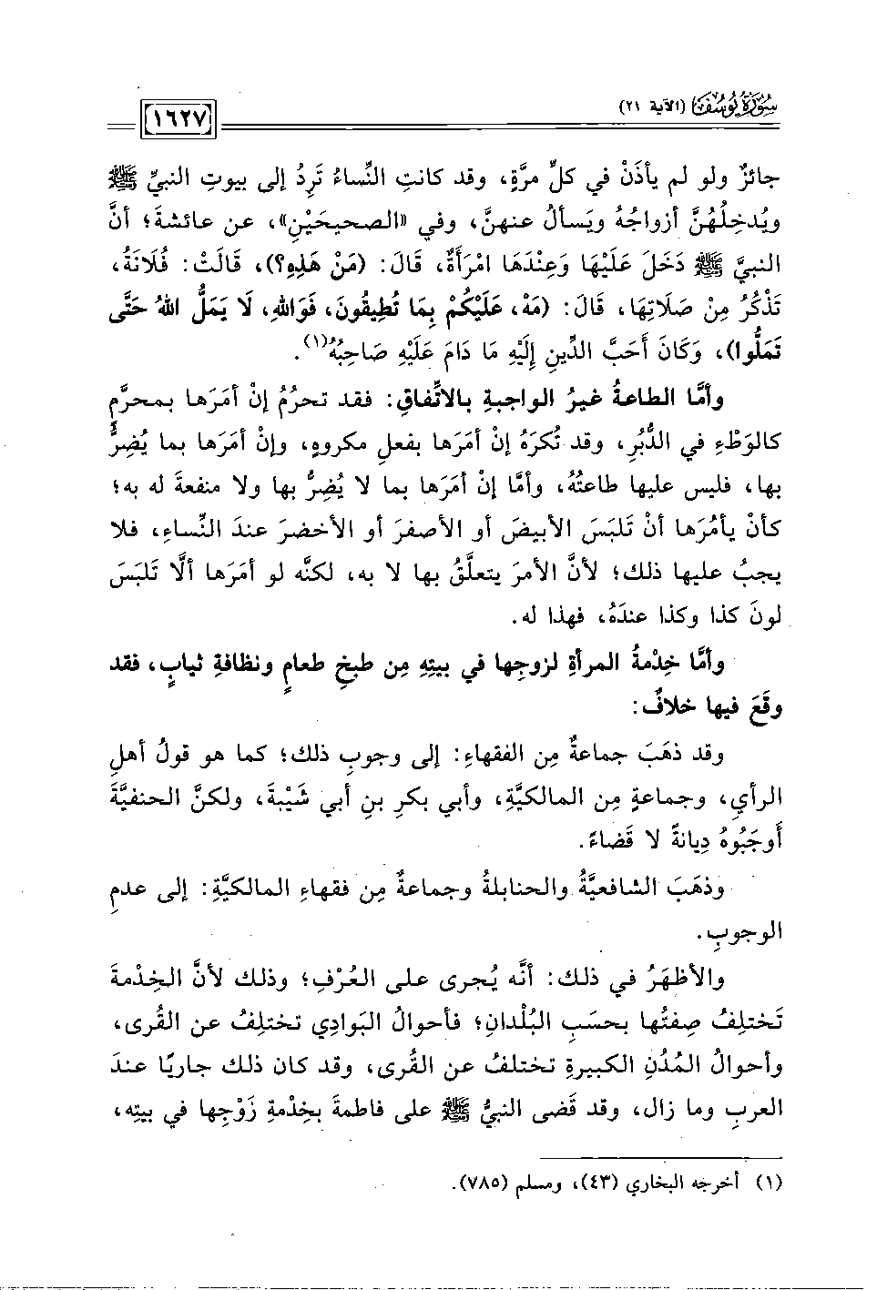 وأمَّا خِدْمةُ المرأةِ لزوجِها في بيتِهِ مِن طبخِ طعامٍ ونظافةِ ثيابٍ، فقد وقَعَ فيها خلافٌ: