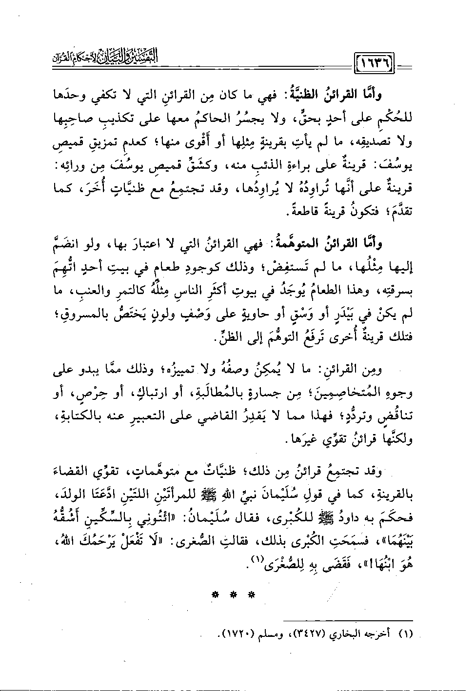 وقد تجتمِعُ قرائنُ مِن ذلك، ظنيَّات مع متوهَّماتٍ، تقوِّي القضاءَ بالقرينة، كما في قولِ سُلَيْمانَ نبيِّ اللهِ - صلى الله عليه وسلم - للمرأتَينِ اللتَيْنِ ادَّعَتَا الولدَ، فحكَمَ به داودُ - صلى الله عليه وسلم - للكُبْرى، فقال سُلَيْمان: "ائتُونِي بِالسِّكِّينِ أَشُقُّهُ بَيْنَهُمَا"، فسمَحَتِ الكُبْرى بذلك، فقالتِ الصُّغرى: "لَا تَفْعَل يَرْحَمُكَ اللهُ، هُوَ ابْنُهَا! "، فَقَضَى بِهِ لِلصُّغرَى (١).