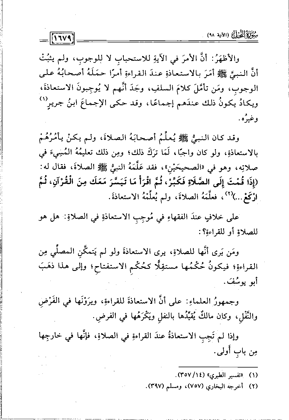 والأظهَرُ: أنَّ الأمرَ في الآيةِ للاستحبابِ لا للوجوبِ، ولم يثبُتْ أنَّ النبيَّ -صلى اللَّه عليه وسلم- أمَرَ بالاستعاذةِ عندَ القراءةِ أمرًا حمَلَهُ أصحابُهُ على الوجوبِ، ومَن تأمَّلَ كلامَ السلفِ، وجَدَ أنَّهم لا يُوجِبونَ الاستعاذةَ، ويكادُ يكونُ ذلك عندَهم إجماعًا، وقد حكى الإجماعَ ابنُ جريرٍ (١) وغيرُه.