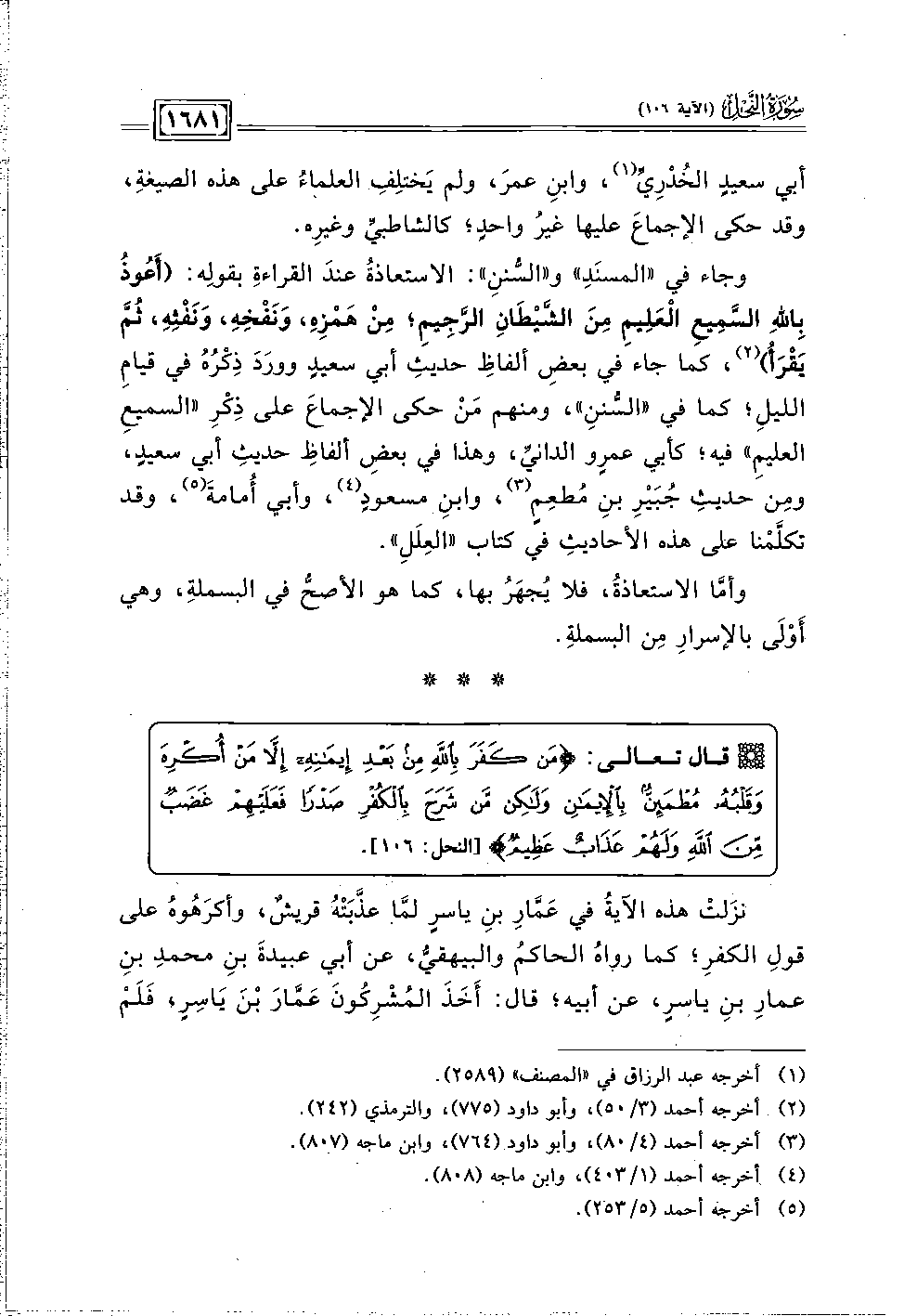 وجاء في "المسنَدِ" و"السُّننِ": الاستعاذةُ عندَ القراءةِ بقولِه: (أعُوذُ بِاللَّهِ السَّمِيعِ الْعَلِيمِ مِنَ الشَّيْطَانِ الرَّجِيمِ؛ مِنْ هَمْزِهِ، وَنَفْخِهِ، وَنَفْثِهِ، ثُمَّ يَقْرَأُ) (٢)، كما جاء في بعضِ ألفاظِ حديثِ أبي سعيدٍ وورَدَ ذِكْرُهُ في قيامِ الليلِ؛ كما في "السُّننِ"، ومنهم مَنْ حكى الإجماعَ على ذِكْرِ "السميعِ العليمِ" فيه؛ كأبي عمرٍو الدانيِّ، وهذا في بعضِ ألفاظِ حديثِ أبي سعيدٍ، ومِن حديثِ جُبَيْرِ بنِ مُطعِمٍ (٣)، وابنِ مسعودٍ (٤)، وأبي أُمامةَ (٥)، وقد تكلَّمْنا على هده الأحاديثِ في كتاب "العِلَلِ".