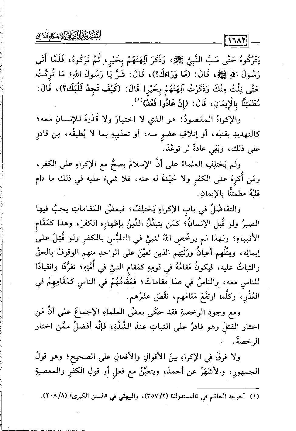 والتفاضُلُ في بابِ الإكراهِ يَختلِفُ؛ فبعضُ المَقاماتِ يجبُ فيها الصبرُ ولو قُتِل الإنسانُ؛ كمَن يتيدَّلُ الدِّينُ بإظهارِه الكفرَ، وهذا كمَقَامِ الأنبياءِ؛ ولهذا لم يرخِّصِ اللَّه لنبيٍّ في التلبُّسِ بالكفرِ ولو قُتِلَ على إيمانِه، ومِثْلُهم أعيانُ ورَثَتِهم الذين تعيَّنَ على الواحدِ منهم الوقوفُ بالحقِّ والثباتُ عليه، فيكونُ مَقامُهُ في قومِهِ كمَقامِ النبيِّ في أُمَّتِهِ؛ تفرُّدًا وانقيادًا للناسِ معه، والناسُ في هذا مقاماتٌ؛ فمَقَامُهُمْ في الناسِ كمَقَامِهِمْ في العُذْرِ، وكلَّما ارتفَعَ مَقامُهم، نقَصَ عذرُهم.