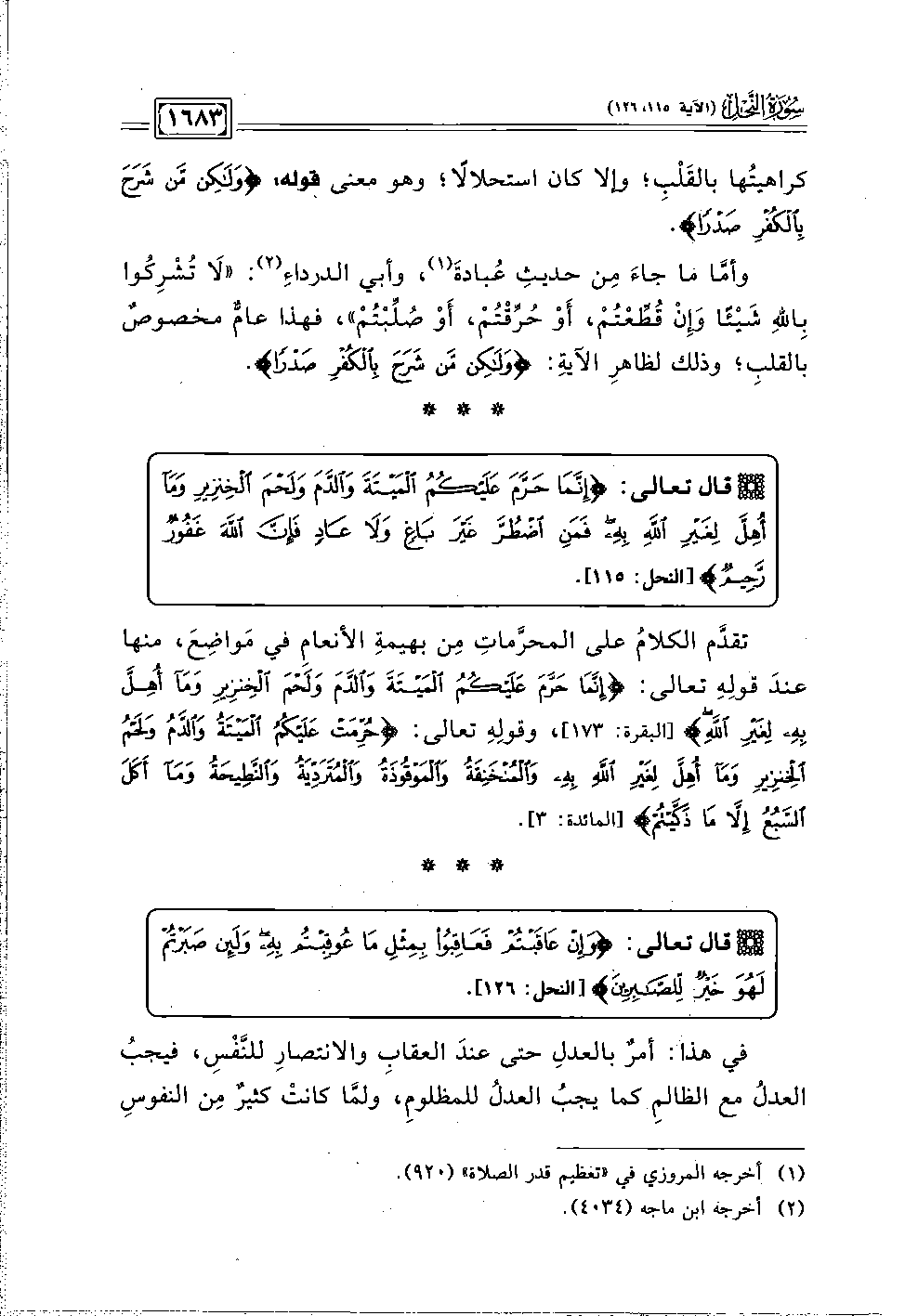 * قال تعالى: {إِنَّمَا حَرَّمَ عَلَيْكُمُ الْمَيْتَةَ وَالدَّمَ وَلَحْمَ الْخِنْزِيرِ وَمَا أُهِلَّ لِغَيْرِ اللَّهِ بِهِ فَمَنِ اضْطُرَّ غَيْرَ بَاغٍ وَلَا عَادٍ فَإِنَّ اللَّهَ غَفُورٌ رَحِيمٌ (١١٥)} [النحل: ١١٥].