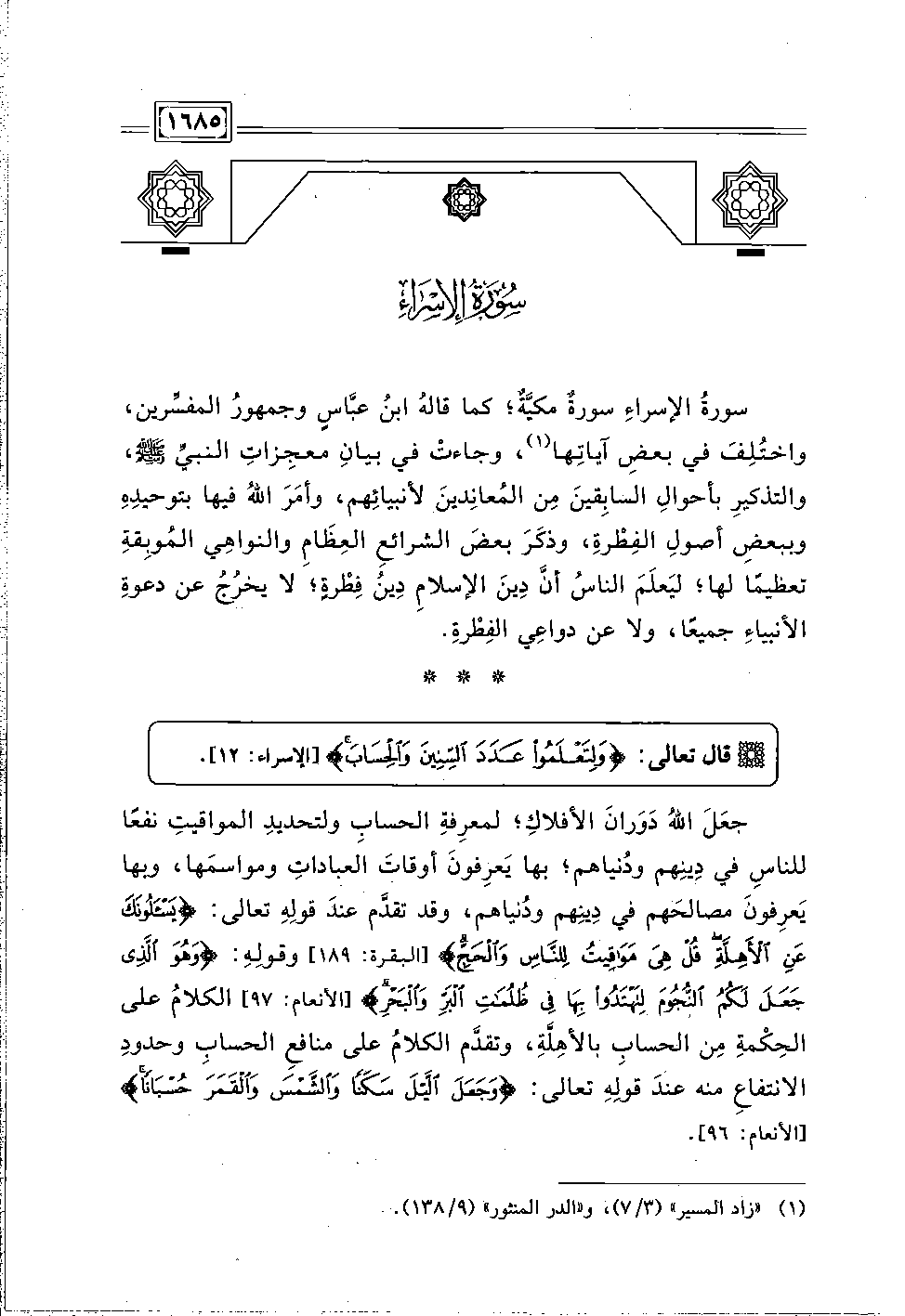 سورةُ الإسراءِ سورةٌ مكيَّةٌ، كما قالهُ ابنُ عبَّاسٍ وجمهورُ المفسِّرين، واختُلِفَ في بعضِ آياتِها (١)، وجاءتْ في بيانِ معجِزاتِ النبيِّ -صلى اللَّه عليه وسلم-، والتذكيرِ بأحوالِ السابِقينَ مِن المُعانِدينَ لأنبيائِهم، وأمَرَ اللَّهُ فيها بتوحيدِهِ وببعضِ أصولِ الفِطْرةِ، وذكَرَ بعضَ الشرائعِ العِظَامِ والنواهِي المُوبِقةِ تعظيمًا لها؛ ليَعلَمَ الناسُ أنَّ دِينَ الإسلامِ دِينُ فِطْرةٍ؛ لا يخرُجُ عن دعوةِ الأنبياءِ جميعًا، ولا عن دواعِي الفِطْرةِ.