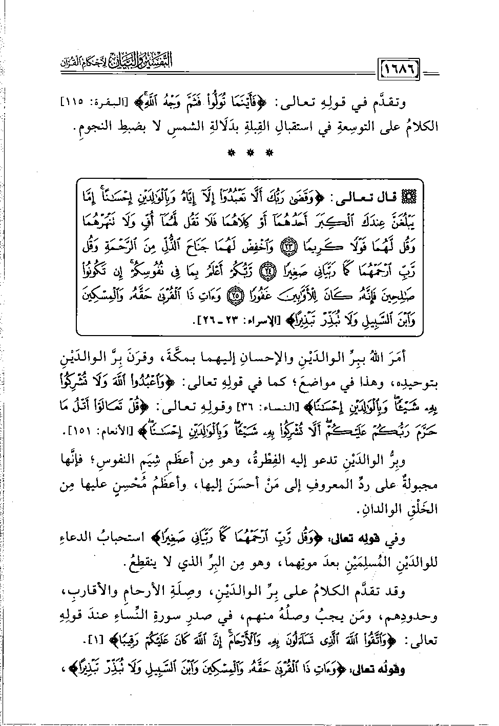 * قال تعالى: {وَقَضَى رَبُّكَ أَلَّا تَعْبُدُوا إِلَّا إِيَّاهُ وَبِالْوَالِدَيْنِ إِحْسَانًا إِمَّا يَبْلُغَنَّ عِنْدَكَ الْكِبَرَ أَحَدُهُمَا أَوْ كِلَاهُمَا فَلَا تَقُلْ لَهُمَا أُفٍّ وَلَا تَنْهَرْهُمَا وَقُلْ لَهُمَا قَوْلًا كَرِيمًا (٢٣) وَاخْفِضْ لَهُمَا جَنَاحَ الذُّلِّ مِنَ الرَّحْمَةِ وَقُلْ رَبِّ ارْحَمْهُمَا كَمَا رَبَّيَانِي صَغِيرًا (٢٤) رَبُّكُمْ أَعْلَمُ بِمَا فِي نُفُوسِكُمْ إِنْ تَكُونُوا صَالِحِينَ فَإِنَّهُ كَانَ لِلْأَوَّابِينَ غَفُورًا (٢٥) وَآتِ ذَا الْقُرْبَى حَقَّهُ وَالْمِسْكِينَ وَابْنَ السَّبِيلِ وَلَا تُبَذِّرْ تَبْذِيرًا (٢٦)} [الإسراء: ٢٣ - ٢٦].