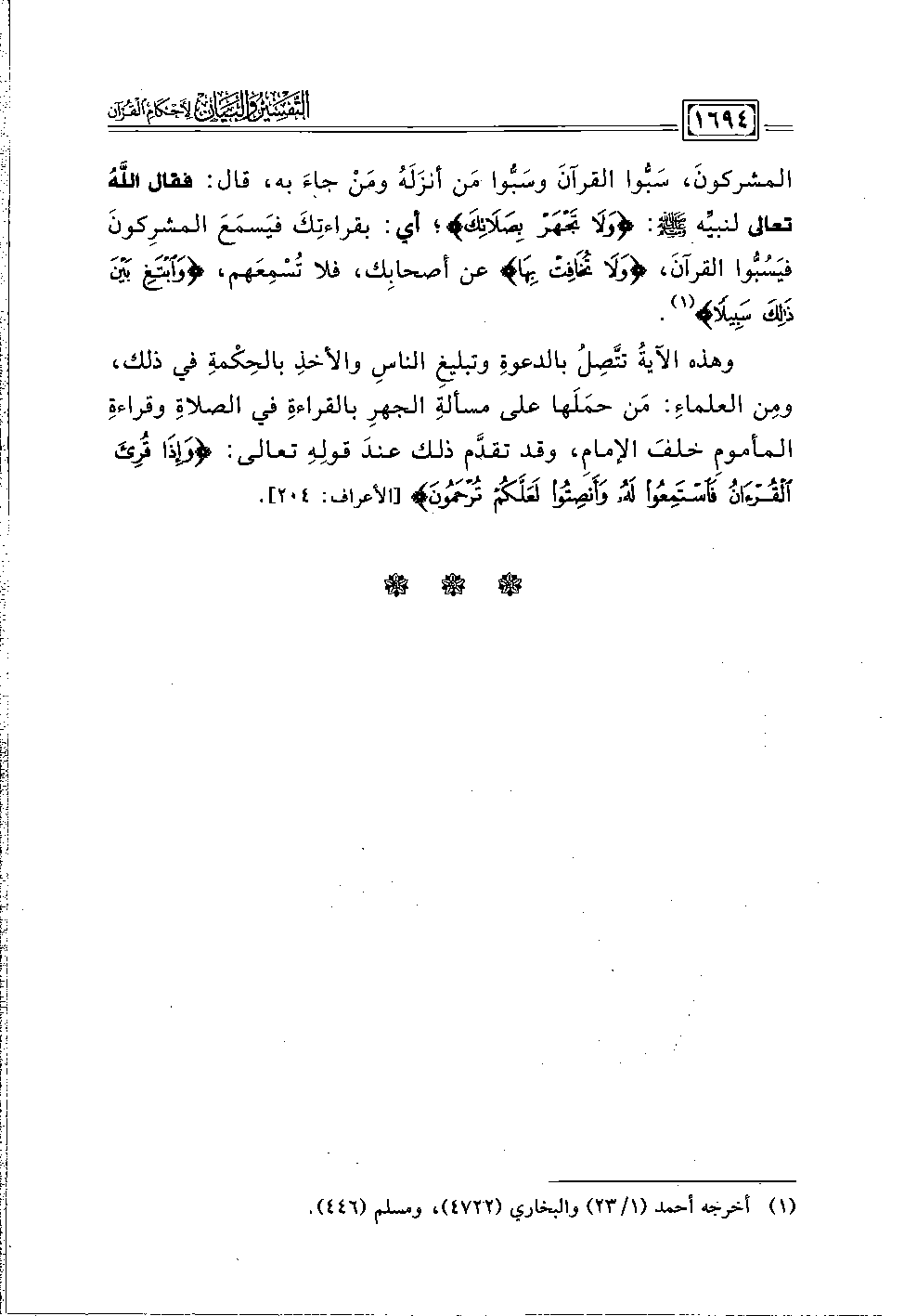 وهذه الآيةُ تتَّصِلُ بالدعوةِ وتبليغِ الناسِ والأخذِ بالحِكْمةِ في ذلك، ومِن العلماءِ: مَن حمَلَها على مسألةِ الجهرِ بالقراءةِ في الصلاةِ وقراءةِ المأمومِ خلفَ الإمامِ، وقد تقدَّم ذلك عندَ قولِهِ تعالى: {وَإِذَا قُرِئَ الْقُرْآنُ فَاسْتَمِعُوا لَهُ وَأَنْصِتُوا لَعَلَّكُمْ تُرْحَمُونَ} [الأعراف: ٢٠٤].