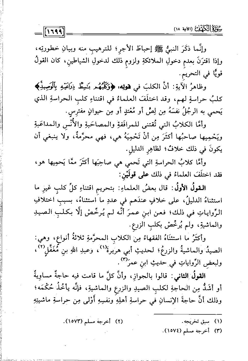 وظاهرُ الآيةِ: أنَّ الكلبَ في قولِهِ: {وَكَلْبُهُمْ بَاسِطٌ ذِرَاعَيْهِ بِالْوَصِيدِ} كلبُ حراسةٍ لهم، وقد اختلَفَ العلماءُ في اقتناءِ كلبِ الحراسةِ الذي يَحمي به الرجُلُ نفسَهُ من لِصٍّ أو مُعْتدٍ أو مِن حيوانٍ مفترِسٍ.