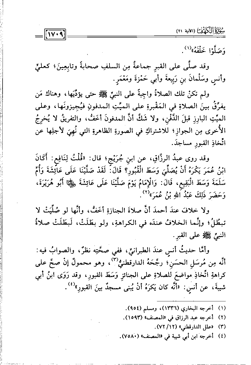 وقد روى عبدُ الرزَّاقِ، عن ابنِ جُرَيْجٍ؛ قال: "قُلْتُ لِنَافِعٍ: أَكَانَ ابْنُ عُمَرَ يَكْرَهُ أَنْ يُصَلِّيَ وَسَطَ الْقُبُورِ؟ قَالَ: لَقَدْ صَلَّيْنَا عَلَى عَائِشَةَ وَأُمِّ سَلَمَةَ وَسَطَ الْبَقِيعِ، قَالَ: وَالْإِمَامُ يَوْمَ صَلَّيْنَا عَلَى عَائِشَةَ -رضي اللَّه عنهما- أَبُو هُرَيْرَةَ، وَحَضَرَ ذَلِكَ عَبْدُ اللَّهِ بْنُ عُمَرَ" (٢).