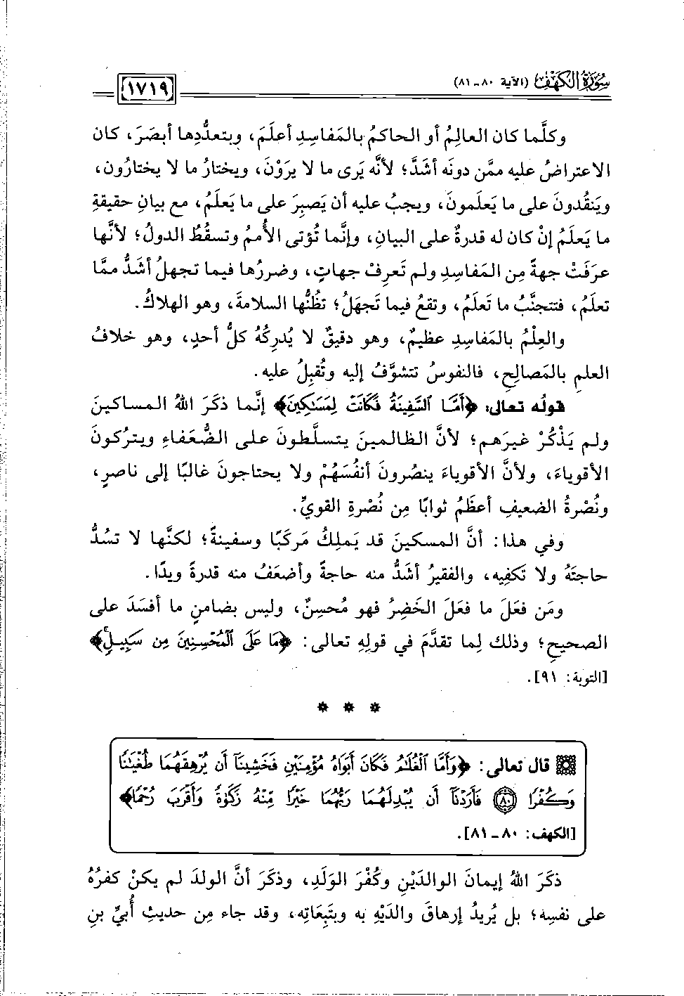 قولُه تعالى: {أَمَّا السَّفِينَةُ فَكَانَتْ لِمَسَاكِينَ} إنَّما ذكَرَ اللَّهُ المساكينَ ولم يَذْكُرْ غيرَهم؛ لأنَّ الظالمينَ يتسلَّطونَ على الضُّعَفاءِ ويترُكونَ الأقوياءَ، ولأنَّ الأقوياءَ ينصُرونَ أنفُسَهُمْ ولا يحتاجونَ غالبًا إلى ناصرٍ، ونُصْرةُ الضعيفِ أعظَمُ ثوابًا مِن نُصْرةِ القويِّ.