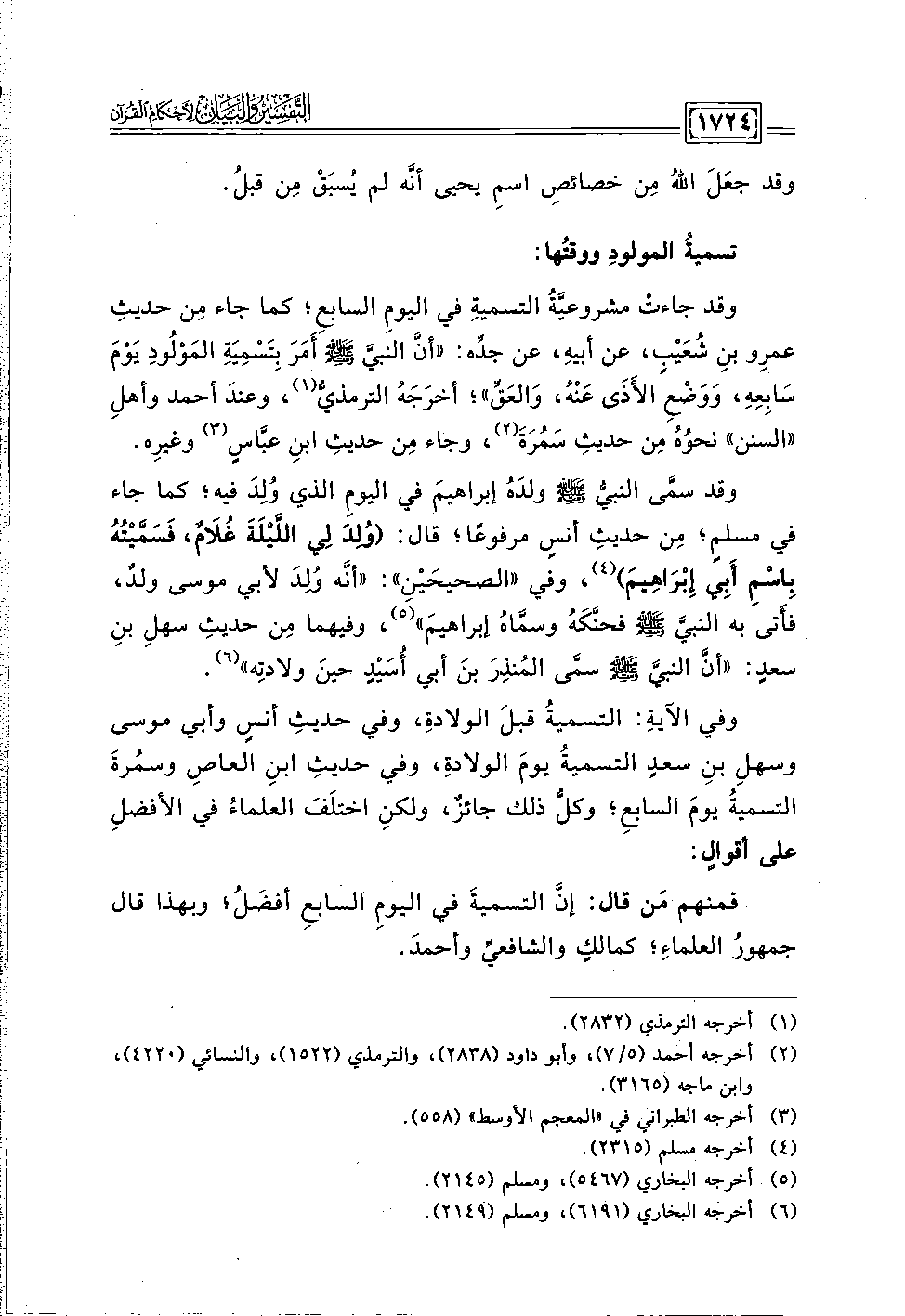 وفي الآيةِ: التسميةُ قبلَ الولادة، وفي حديثِ أنسٍ وأبي موسى وسهلِ بنِ سعدٍ التسميةُ يومَ الولادة، وفي حديثِ ابنِ العاصِ وسمُرةَ التسميةُ يومَ السابعِ؛ وكلٌّ ذلك جائزٌ، ولكنِ اختلَفَ العلماءُ في الأفضلِ على أقوالٍ: