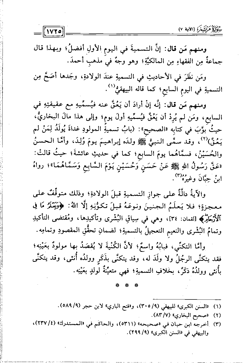 ومنهم مَن قال: إنَّه إنْ أرادَ أن يَعُقَّ عنه فيُسمِّيهِ مع عقيقتِهِ في السابعِ، ومَن لم يُرِدْ أن يَعُقَّ فيُسمِّيهِ أولَ يومٍ؛ وإلي هذا مالَ البخاريُّ، حيثُ بوَّبَ في كتابِه "الصحيحِ": (بابُ تسميةِ المولودِ غداةَ يُولَدُ لِمَن لم يَعُق) (٢)، وقد سمَّى النبيُّ -صلى اللَّه عليه وسلم- ولدَه إبراهيم يومَ وُلدَ، وأمَّا الحسنُ والحُسَيْنُ، فسمَّاهُما يومَ السابعِ؛ كما في حديثِ عائشةَ؛ حيثُ قالتْ: "عَقَّ رَسُولُ اللَّهِ -صلى اللَّه عليه وسلم- عَن حَسَنٍ وَحُسَيْنٍ يَوْمَ السَّابِعِ وَسَمَّاهُمَا"؛ رواهُ ابنُ حِبَّانَ وغيرُهُ (٣).