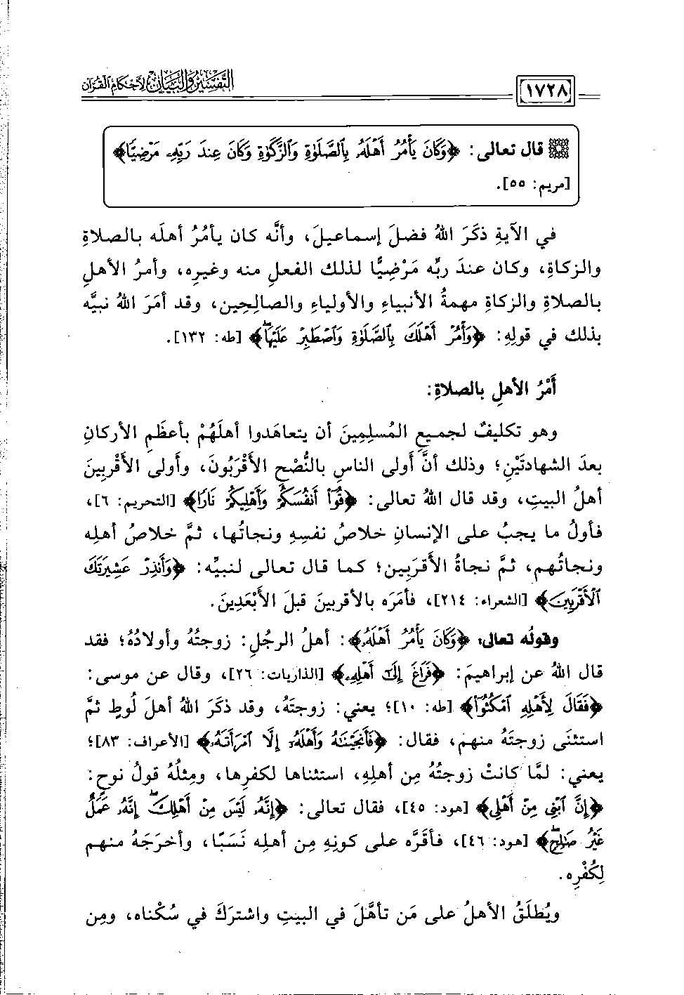 وقولُه تعالى: {وَكَانَ يَأْمُرُ أَهْلَهُ}: أهلُ الرجُلِ: زوجتُهُ وأولادُهُ؛ فقد قال اللَّه عن إبراهيمَ: {فَرَاغَ إِلَى أَهْلِهِ} [الذاريات: ٢٦]، وقال عن موسى: {فَقَالَ لِأَهْلِهِ امْكُثُوا} [طه: ١٠]؛ يعني: زوجتَهُ، وقد ذكَرَ اللَّهُ أهلَ لُوطٍ ثمَّ استثنَى زوجتَهُ منهم، فقال: {فَأَنْجَيْنَاهُ وَأَهْلَهُ إِلَّا امْرَأَتَهُ} [الأعراف: ٨٣]؛ يعني: لمَّا كانتْ زوجتُهُ مِن أهلِه، استثناها لكفرِها، ومِثلُهُ قولُ نوحٍ: {إِنَّ ابْنِي مِنْ أَهْلِي} [هود: ٤٥]، فقال تعالى: {إِنَّهُ لَيْسَ مِنْ أَهْلِكَ إِنَّهُ عَمَلٌ غَيْرُ صَالِحٍ} [هود: ٤٦]، فأَقَرَّه على كونِهِ مِن أهلِه نَسَبًا، وأخرَجَهُ منهم لِكُفْرِه.