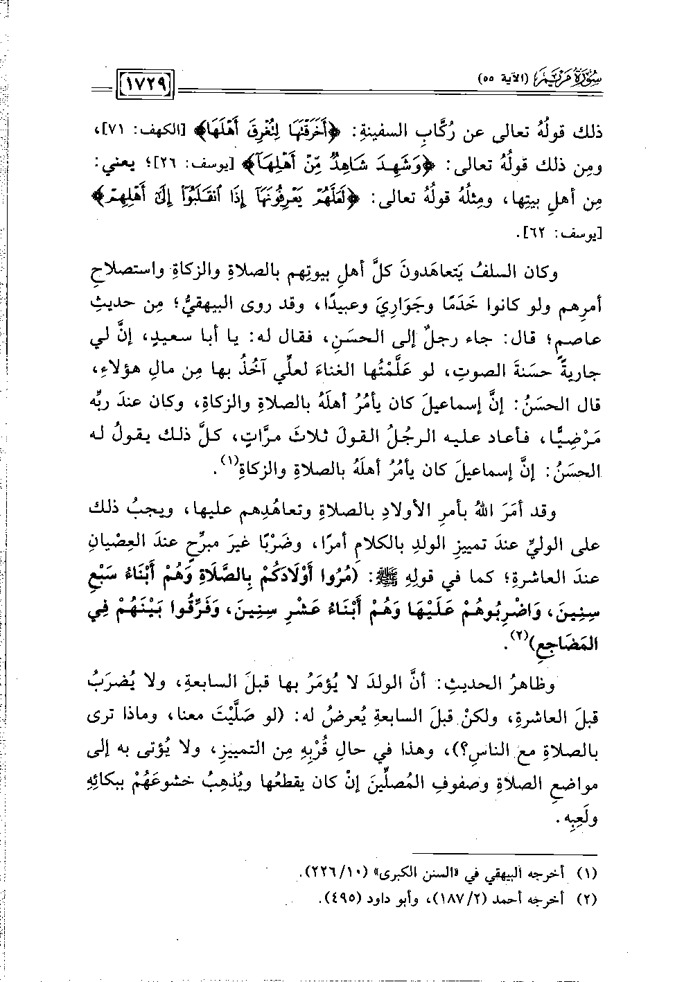 وكان السلفُ يَتعاهَدونَ كلَّ أهلِ بيوتِهم بالصلاةِ والزكاةِ واستصلاحِ أمرِهم ولو كانوا خَدَمًا وجَوَارِيَ وعبيدًا، وقد روى الببهقىُّ؛ مِن حديثِ عاصمٍ؛ قال: جاء رجلٌ إلى الحسَنِ، فقال له: يا أبا سعيدٍ، إنَّ لي جاريةً حسَنةً الصوتِ، لو عَلَّمْتُها الغناءَ لعلِّي آخُذُ بها مِن مالِ هؤلاءِ، قال الحسَنُ: إنَّ إسماعيلَ كان يأمُرُ أهلَهُ بالصلاةِ والزكاةِ، وكان عندَ ربِّه مَرضِيًّا، فأعاد عليه الرجُلُ القولَ ثلاثَ مرَّاتٍ، كلَّ ذلك يقولُ له الحسَنُ: إنَّ إسماعلَ كان يأمُرُ أهلَهُ بالصلاةِ والزكاةِ (١).