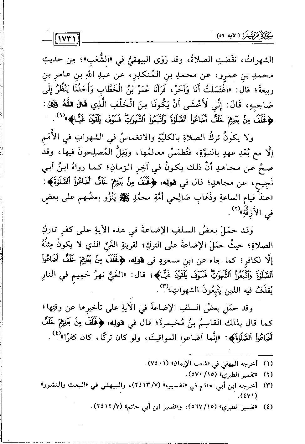 وقد حمَلَ بعضُ السلفِ الأضاعةَ في هذه الآيةِ على كفرِ تاركِ الصلاةِ؛ حيثُ حمَلَ الإضاعةَ على التركِ؛ لقربةِ الغَيِّ الذي لا يكونُ مِثلُهُ إلَّا لكافرٍ؛ كما جاء عن ابنِ مسعودٍ في قولِه: {فَخَلَفَ مِنْ بَعْدِهِمْ خَلْفٌ أَضَاعُوا الصَّلَاةَ وَاتَّبَعُوا الشَّهَوَاتِ فَسَوْفَ يَلْقَوْنَ غَيًّا}؛ قال: "الغَيُّ نهرٌّ حَمِيمٍ في النارِ يُقذَفُ فيه الذين يَتَّبِعُونَ الشهواتِ" (٣).