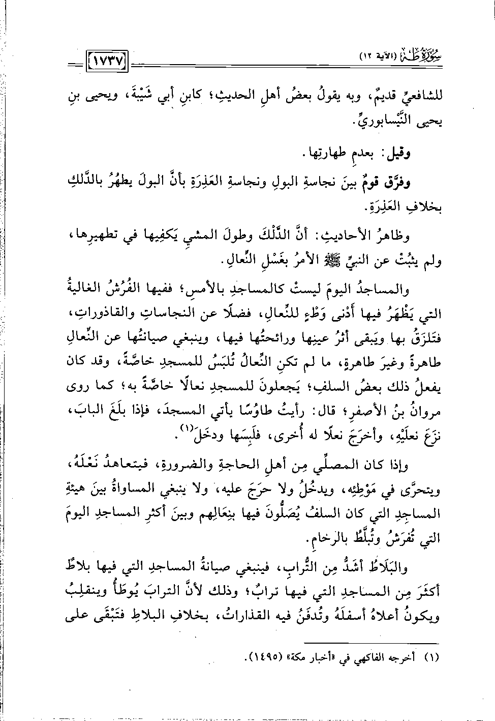 وإذا كان المصلِّي مِن أهلِ الحاجةِ والضرورةِ، فيتعاهدُ نَعْلَهُ، ويتحرَّى في مَوْطِئِه، ويدخُلُ ولا حرَجَ عليه، ولا ينبغي المساواةُ بين هيئةِ المساحِدِ التي كان السلفُ يُصَلُّونَ فيها بنِعَالِهم وببنَ أكثرِ المساجدِ اليومَ التي تُفرَشُ وتُبلَّطُ بالرخامِ.