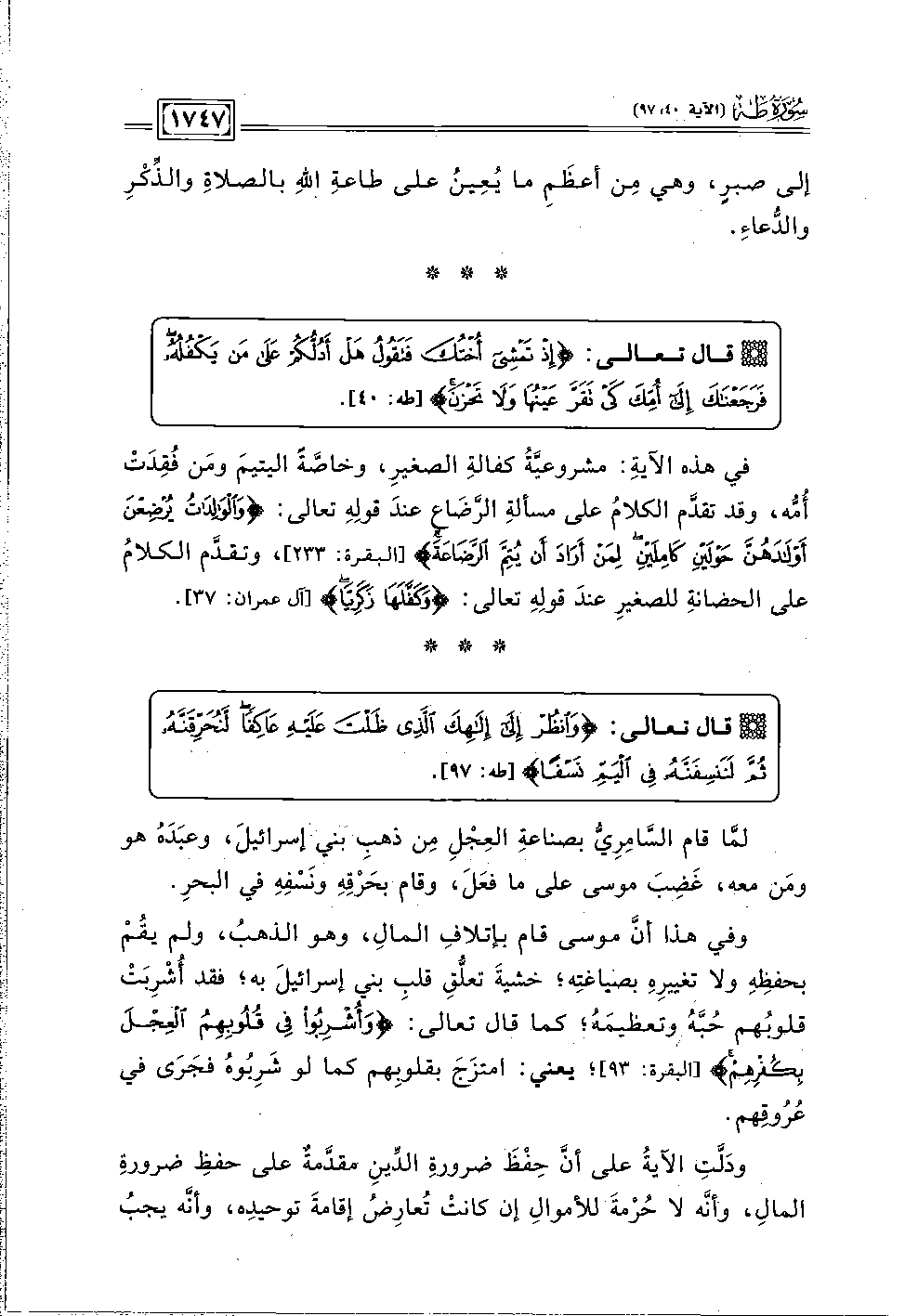 وفي هذا أنَّ موسى قام بإتلافِ المالِ، وهو الذهبُ، ولم يقُمْ بحفظِهِ ولا تغييرِهِ بصياغتِه؛ خشيةَ تعلُّقِ قلبِ بني إسرائيلَ به؛ فقد أُشرِبَتْ قلوبُهم حُبَّهُ وتعظيمَهُ؛ كما قال تعالى: {وَأُشْرِبُوا فِي قُلُوبِهِمُ الْعِجْلَ بِكُفْرِهِمْ} [البقرة: ٩٣]؛ يعني: امتزَجَ بقلوبِهم كما لو شَرِبُوه فجَرَى في عُرُوقِهم.