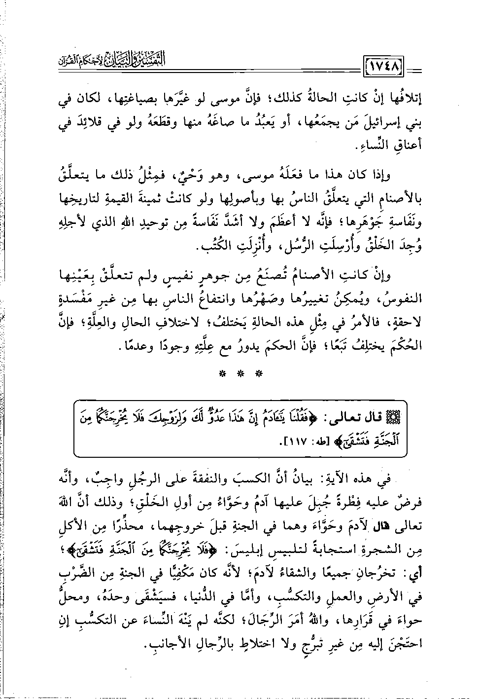 في هذه الآيةِ: بيانُ أنَّ الكسبَ والنفقةَ على الرجُلِ واجِبٌ، وأنَّه فرضٌ عليه فِطْرةً جُبِلَ عليها آدمُ وحَوَّاءُ مِن أولِ الخَلْقِ؛ وذلك أنَّ اللَّهَ تعالى قال لآدمَ وحَوَّاءَ وهما في الجنةِ قبلَ خروجِهما، محذِّرًا مِن الأكلِ مِن الشجرةِ استجابةً لتلبيس إبليسَ: {فَلَا يُخْرِجَنَّكُمَا مِنَ الْجَنَّةِ فَتَشْقَى}؛ أي: تخرُجانِ جميعًا والشقاءُ لآدمَ؛ لأنَّه كان مَكْفِيًّا في الجنةِ مِن الضَّرْبِ في الأرضِ والعملِ والتكسُّبِ، وأمَّا في الدُّنيا، فسيَشْقَى وحدَهُ، ومحلُّ حواءَ في قَرَارِها، واللَّهُ أمَرَ الرِّجَالَ؛ لكنَّه لم يَنْهَ النِّساءَ عن التكسُّبِ إنِ احتَجْنَ إليه مِن غيرِ تبرُّجٍ ولا اختلاطٍ بالرِّجالِ الأجانبِ.