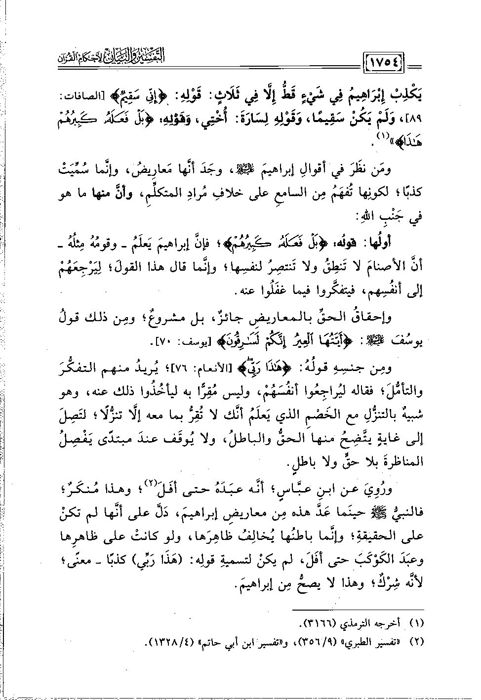 يَكْذِبْ إِبْرَاهِيمُ فِي شَيْءٍ قَطُّ إِلَّا فِي ثَلَاثٍ: قَوْلِهِ: {إِنِّي سَقِيمٌ} [الصافات: ٨٩]، وَلَمْ يَكُنْ سَقِيمًا، وَقَوْلِهِ لِسَارَةَ: أُخْتِي، وَقَوْلِهِ: {بَلْ فَعَلَهُ كَبِيرُهُمْ هَذَا} " (١).
