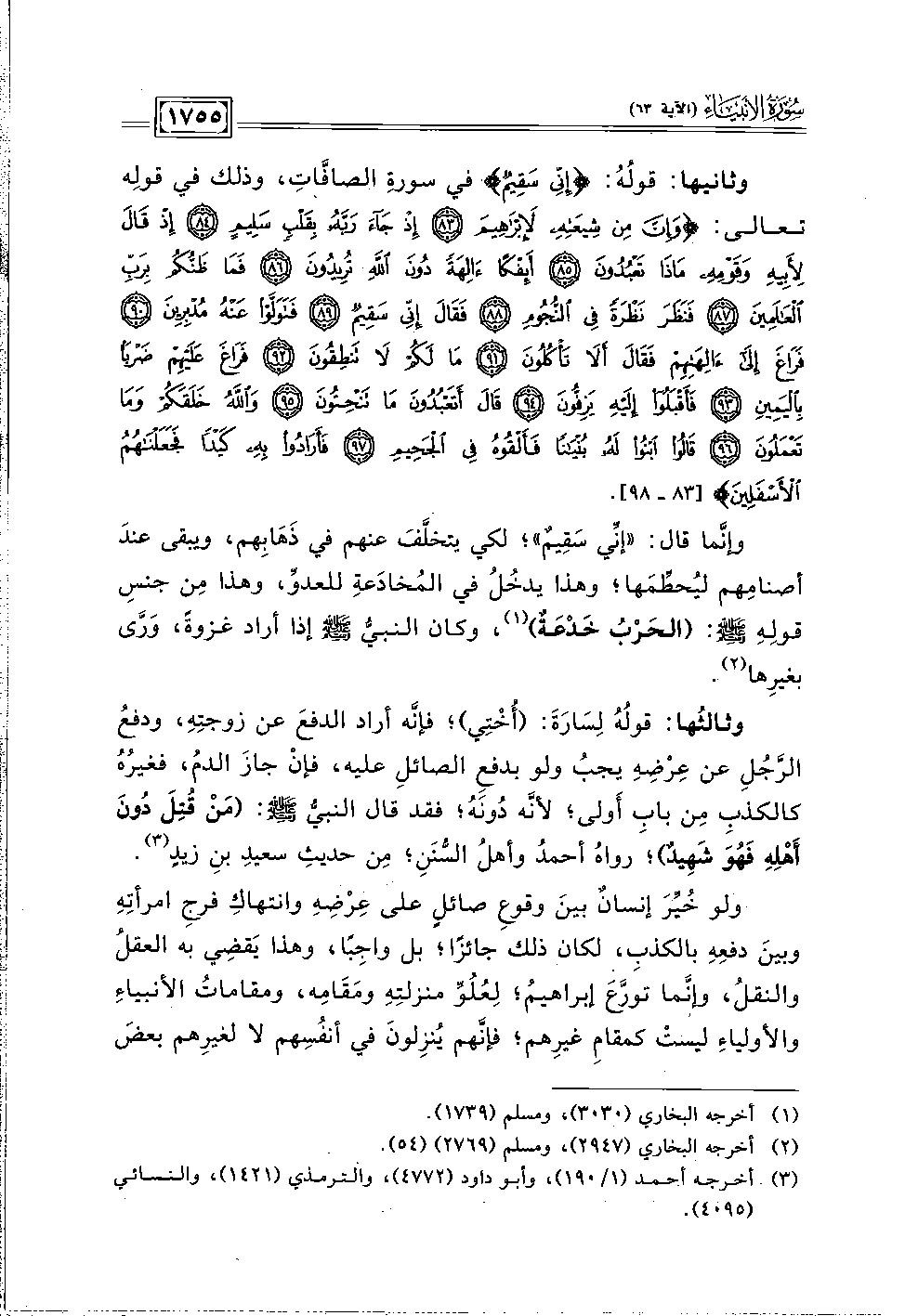 ولو خُيِّرَ إنسانٌ بينَ وقوعِ صائلٍ على عِرْضِهِ وانتهاكِ فرجِ امرأتِهِ وبينَ دفعِهِ بالكذبِ، لكان ذلك جائزًا؛ بل واجِبًا، وهذا يَقضِي به العقلُ والنقلُ، وإنَّما تورَّعَ إبراهيمُ؛ لِعُلوِّ منزلتِهِ ومَقَامِه، ومقاماتُ الأنبياءِ والأولياءِ ليستْ كمقامِ غيرِهم؛ فإنَّهم يُنزِلونَ في أنفُسِهم لا لغيرِهم بعضَ