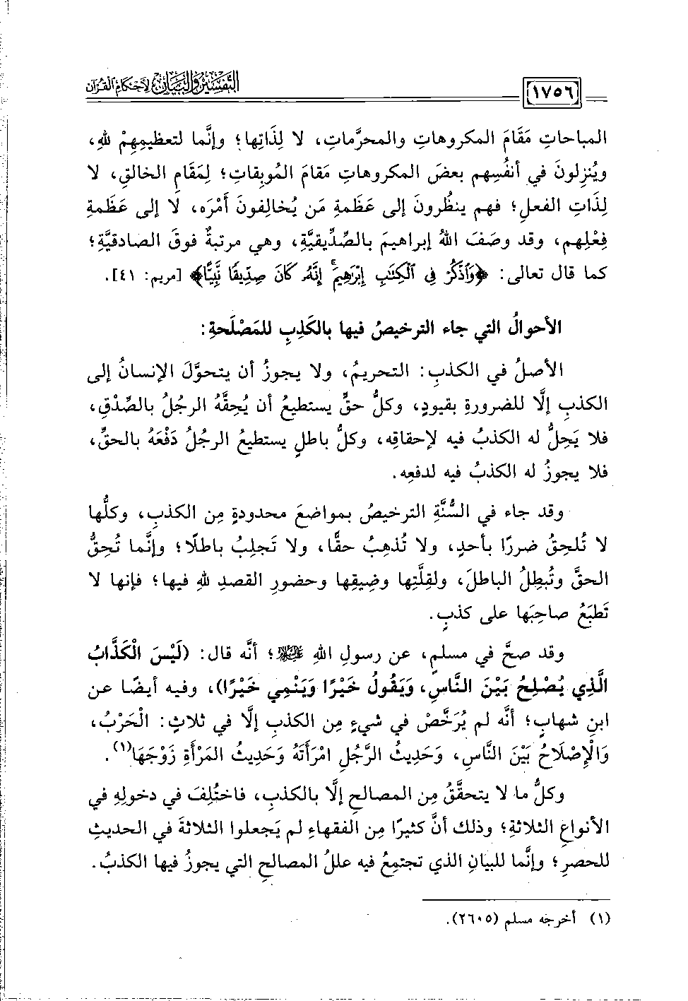 وقد صحَّ في مسلمٍ، عن رسولِ اللَّهِ عليه السلام؛ أنَّه قال: (لَيْسَ الْكَذَّابُ الَّذِي يُصلِحُ بَينَ النَّاسِ، وَيَقُولُ خَيْرًا وَيَنْمِي خَيْرًا)، وفيه أيضًا عن ابنِ شهابٍ؛ أنَّه لم يُرَخَّصْ في شيءٍ مِن الكذبِ إلَّا في ثلاثٍ: الْحَرْبُ، وَالْإِصْلَاحُ بَيْن النَّاسِ، وَحَدِيثُ الرَّجُلِ امْرَأَتَهُ وَحَدِيثُ المَرْأَةِ زَوْجَهَا (١).