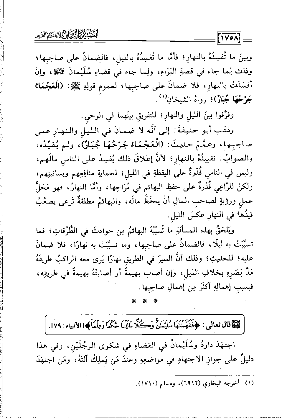 وبينَ ما تُفسِدُهُ بالنهارِ؛ فأمَّا ما تُفسِدُهُ بالليلِ، فالضمانُ على صاحِبِها؛ وذلك لِما جاء في قصةِ البَرَاءِ، ولِما جاء في قصاءِ سُلَيْمانَ عليه السلام، وإنْ أفسَدَتْ بالنهارِ، فلا ضمانَ على صاحِبِها؛ لعمومِ قولِهِ -صلى اللَّه عليه وسلم-: (الْعَجْمَاءُ جَرْحُهَا جُبَارٌ)؛ رواهُ الشيخانِ (١).