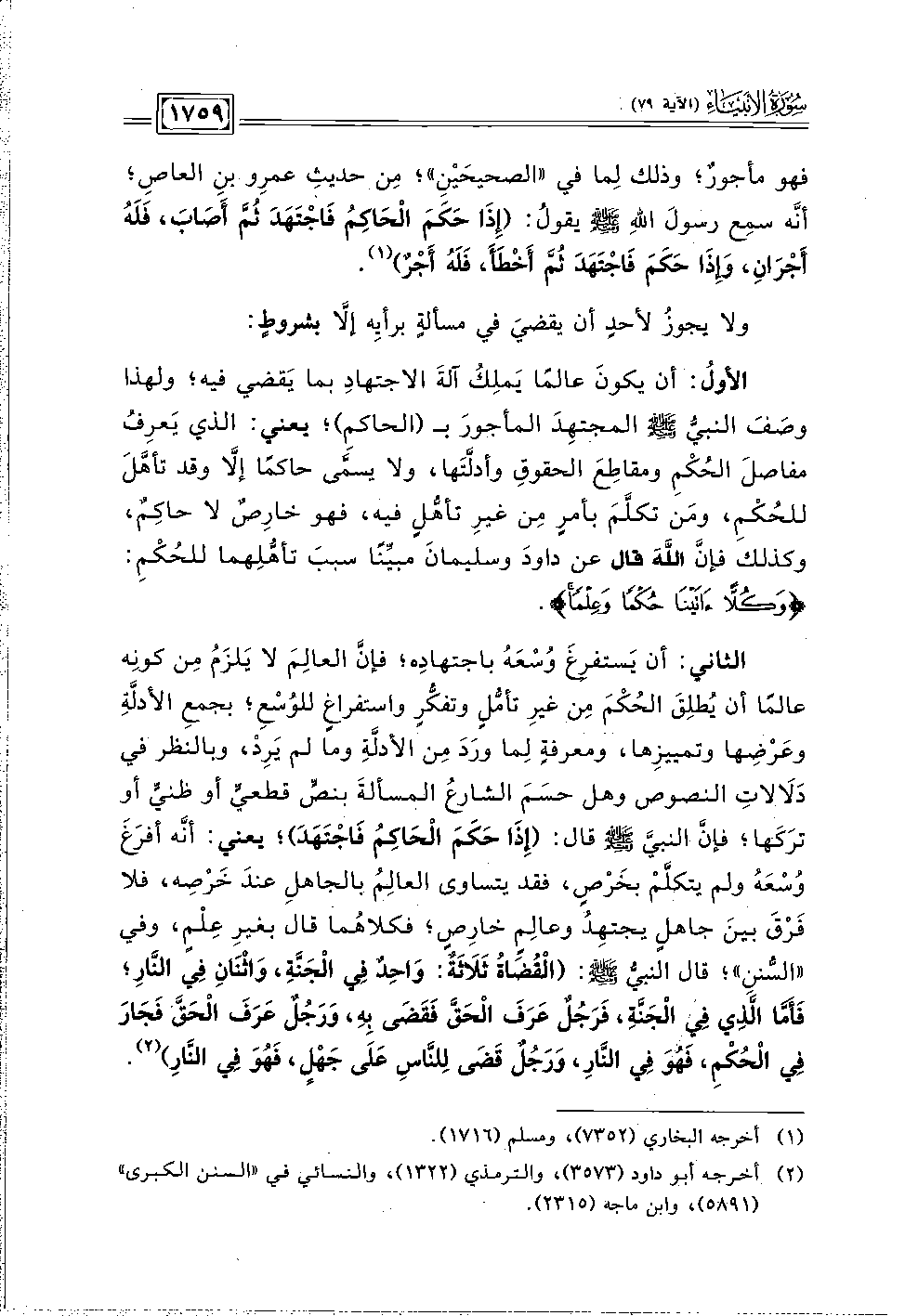 ولا يجوزُ لأحدٍ أن يقضيَ في مسألةٍ برأيِه إلَّا بشروطٍ: