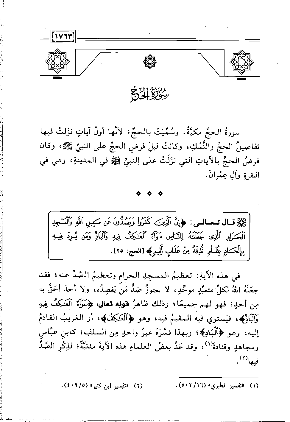 * قال تعالى: {إِنَّ الَّذِينَ كَفَرُوا وَيَصُدُّونَ عَنْ سَبِيلِ اللَّهِ وَالْمَسْجِدِ الْحَرَامِ الَّذِي جَعَلْنَاهُ لِلنَّاسِ سَوَاءً الْعَاكِفُ فِيهِ وَالْبَادِ وَمَنْ يُرِدْ فِيهِ بِإِلْحَادٍ بِظُلْمٍ نُذِقْهُ مِنْ عَذَابٍ أَلِيمٍ} [الحج: ٢٥].