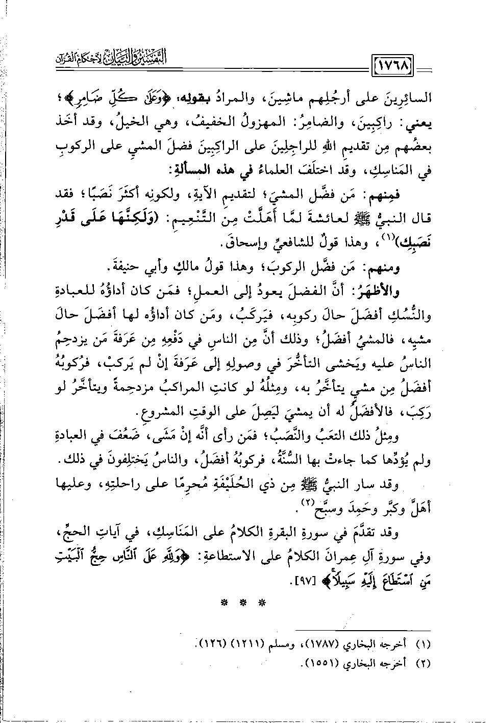 فمِنهم: مَن فضَّل المشيَ؛ لتقديمِ الآيةِ، ولكونِه أكثَرَ نَصَبًا؛ فقد قال النبيُّ -صلى اللَّه عليه وسلم- لعائشةَ لمَّا أَهَلَّتْ مِن التَّنْعِيمِ: (وَلَكِنَّهَا عَلَى قَدْرِ نَصَبِكِ) (١)، وهذا قولٌ للشافعيِّ وإسحاقَ.