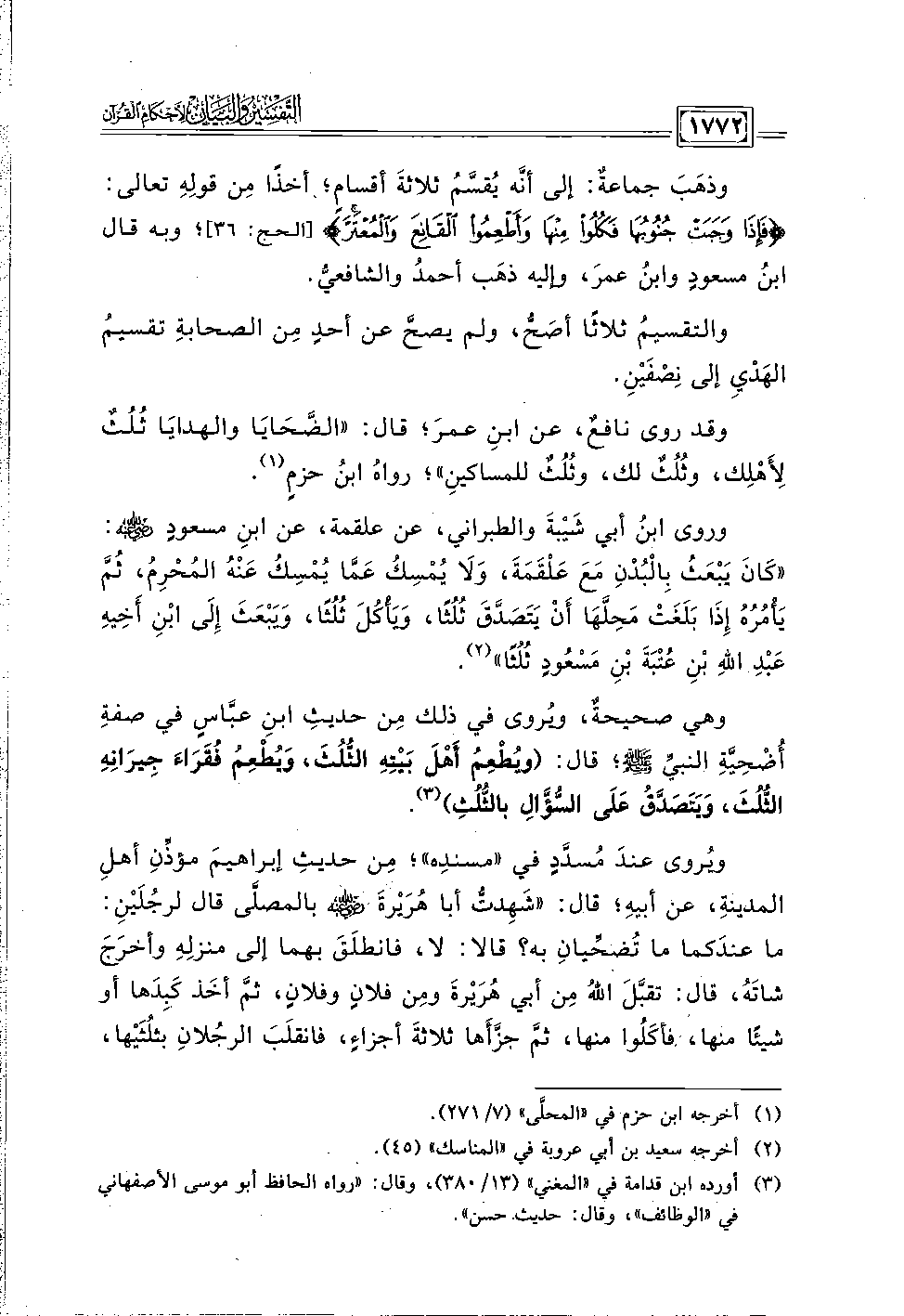 وذهَبَ جماعةٌ: إلى أنَّه يُقسَّمُ ثلاثةَ أقسامٍ؛ أخذًا مِن قولِهِ تعالى: {فَإِذَا وَجَبَتْ جُنُوبُهَا فَكُلُوا مِنْهَا وَأَطْعِمُوا الْقَانِعَ وَالْمُعْتَرَّ} [الحج: ٣٦]؛ وبه قال ابنُ مسعودٍ وابنُ عمرَ، وإليه ذهَب أحمدُ والشافعيُّ.