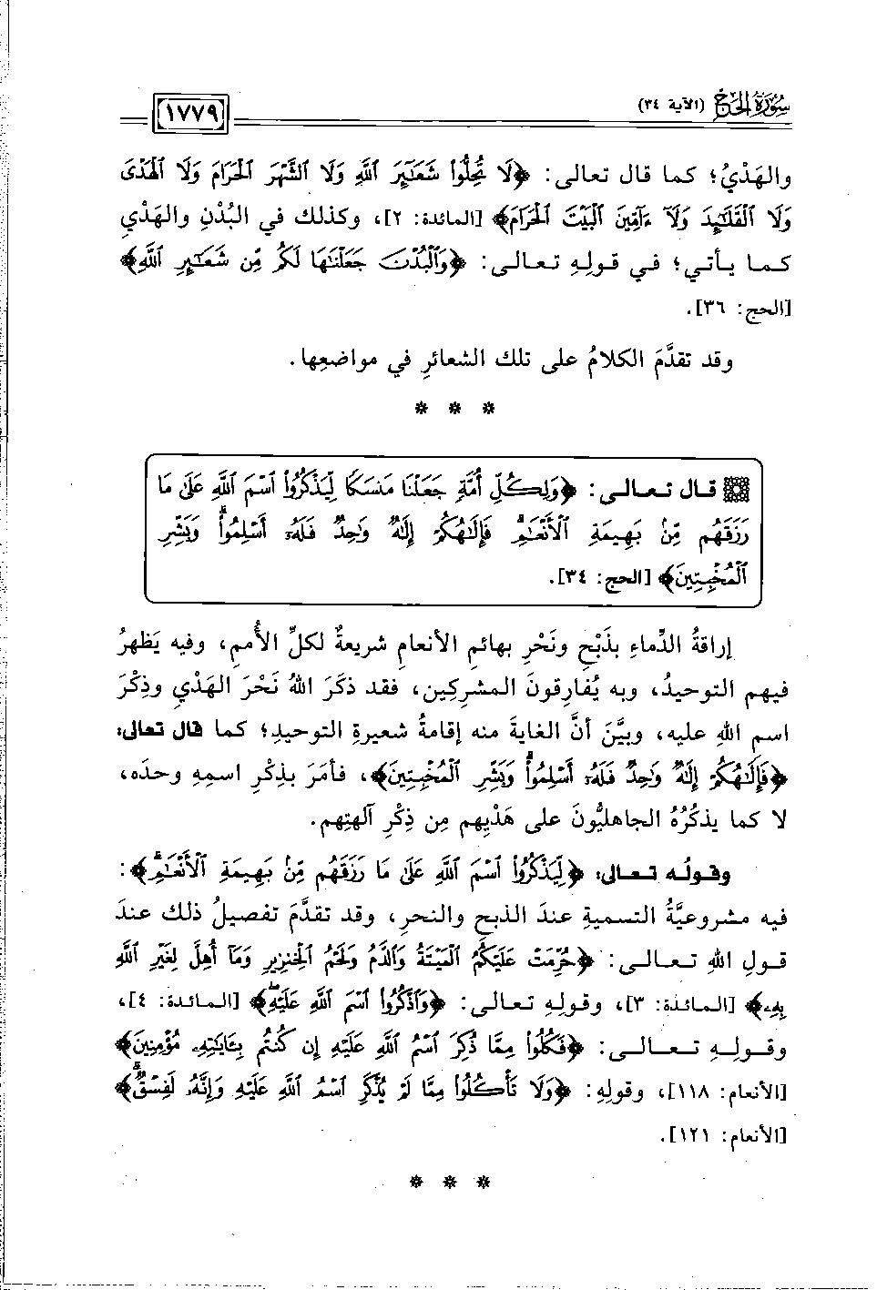 وقولُه تعالى: {لِيَذْكُرُوا اسْمَ اللَّهِ عَلَى مَا رَزَقَهُمْ مِنْ بَهِيمَةِ الْأَنْعَامِ}: فيه مشروعيَّةَ التسميةِ عندَ الذبح والنحرِ، وقد تقدَّمَ تفصيلُ ذلك عندَ قولِ اللَّهِ تعالى: {حُرِّمَتْ عَلَيْكُمُ الْمَيْتَةُ وَالدَّمُ وَلَحْمُ الْخِنْزِيرِ وَمَا أُهِلَّ لِغَيْرِ اللَّهِ بِهِ} [المائدة: ٣] وقولِهِ تعالى: {وَاذْكُرُوا اسْمَ اللَّهِ عَلَيْهِ} [المائدة: ٤]، وقولِهِ تعالى: {فَكُلُوا مِمَّا ذُكِرَ اسْمُ اللَّهِ عَلَيْهِ إِنْ كُنْتُمْ بِآيَاتِهِ مُؤْمِنِينَ (١١٨)} [الأنعام: ١١٨]، وقولِهِ: {وَلَا تَأْكُلُوا مِمَّا لَمْ يُذْكَرِ اسْمُ اللَّهِ عَلَيْهِ وَإِنَّهُ لَفِسْقٌ} [الأنعام: ١٢١].