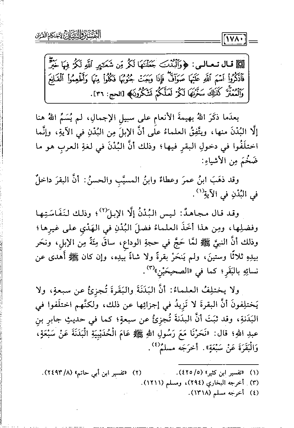 بعدَما ذكَرَ اللَّهُ بهيمةَ الأنعامِ على سبيل الإجمالِ، لم يُسَمِّ اللَّهُ هنا إلَّا، البُدْنَ منها، ويتَّفِقُ العلماءُ على أنَّ الإبلَ مِن البُدْنِ في الآيةِ، وإنَّما اختلَفُوا في دخولِ البقرِ فيها؛ وذلك أنَّ البُدْنَ في لغةِ العربِ هو ما ضَخُمَ مِن الأشياءِ: